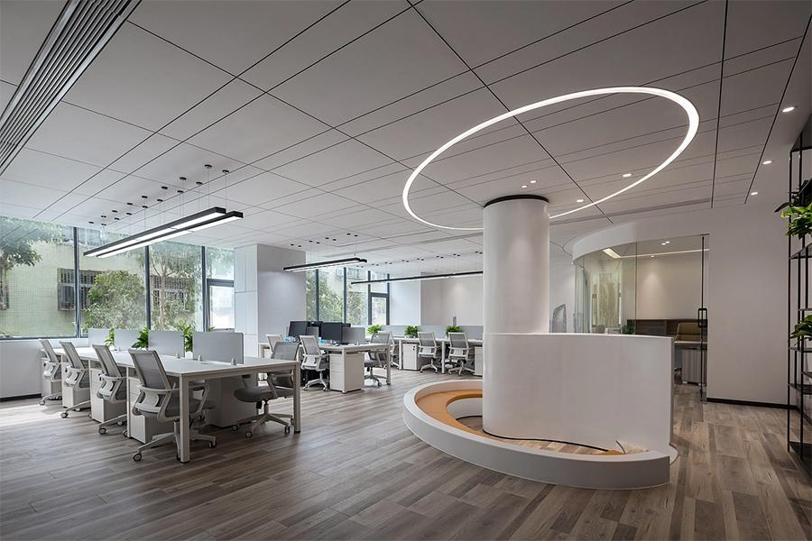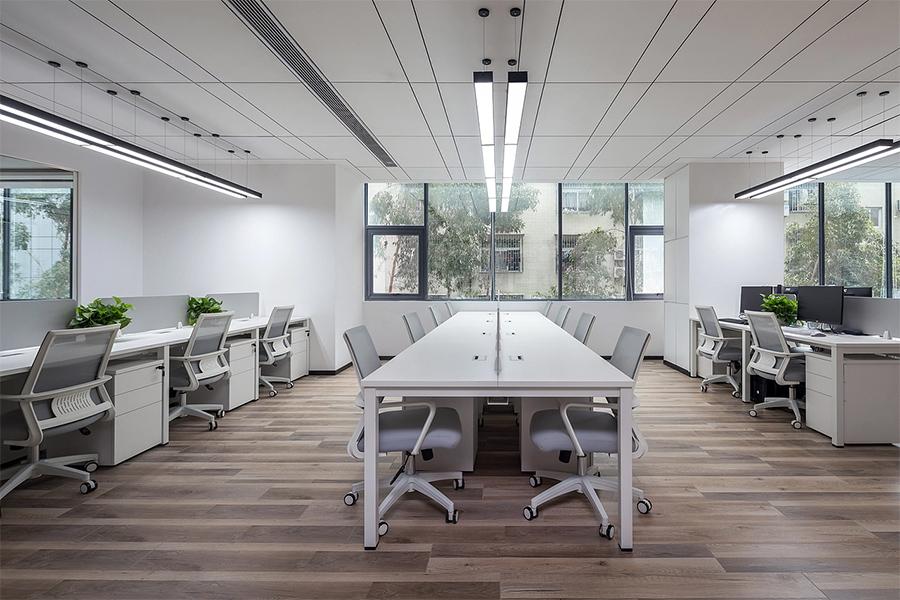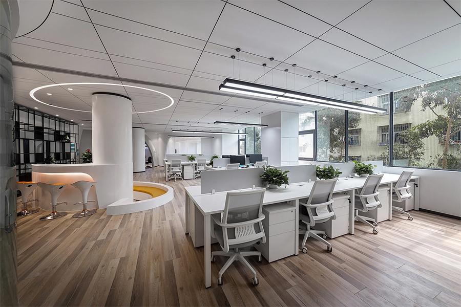 穿过会议室,开放式办公区以轻盈高效的姿态铺展开来。白色柜体与浅灰人体工学椅构成清爽的视觉基底,模块化工位布局既保留了团队协作的互动性,又以绿植隔断营造出恰到好处的个人专注空间。悬挂式条形灯与顶面筒灯的组合,巧妙解决了大空间的照明死角;升降式办公桌的配置,则适配了不同员工的办公习惯 —— 四川壹西格玛深知,成华区的企业既有新兴团队的活力节奏,也有成熟品牌的稳定需求,因此在空间规划中特意预留了工位弹性调整的可能,让办公区能随企业规模同步生长,无需为后续扩张重复消耗成本。