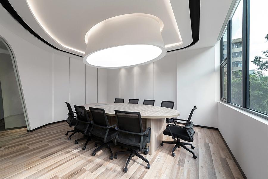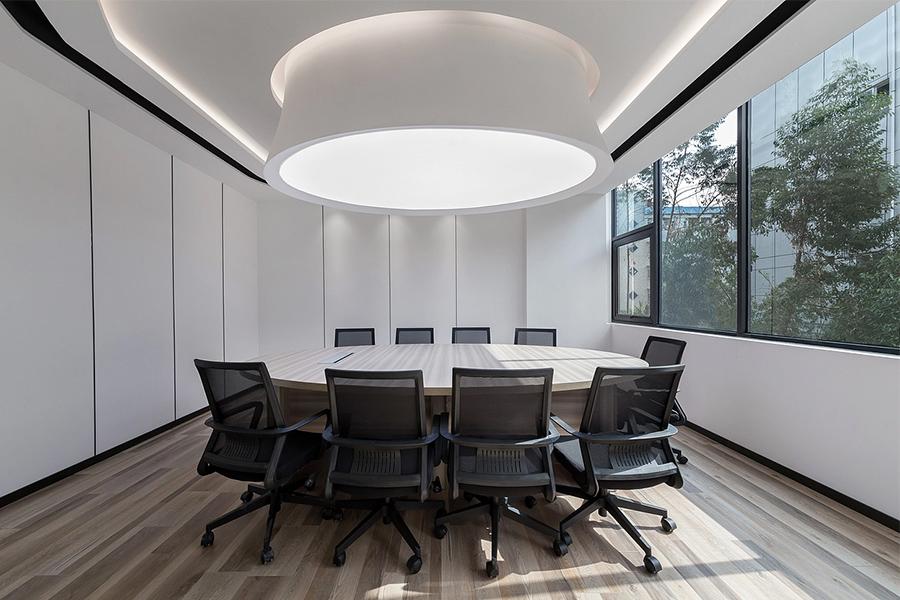 推开这处成都市成华区办公室的门,最先抵达的是以光与形为核心的会议室。弧形嵌入式灯光如流云般环绕顶面,配合中央悬浮式的圆形灯盘,将柔和光线均匀铺洒在浅木纹会议桌上,既消解了传统会议室的沉闷感,又以极简线条勾勒出商务洽谈的专业氛围。通透的窗景与玻璃隔断相呼应,将室外成华区的城市绿意引入室内,让每一次头脑风暴都伴着自然的呼吸;而四川壹西格玛的施工团队在细节处的考量,更显本地服务的精准 —— 耐磨防滑的木纹地板适配成都潮湿的气候特性,环保阻燃的墙面饰板贴合最新室内装修标准,每一种材质的选择,都是实用与美学的双向奔赴,让空间既经得起长期使用的考验,又能时刻保持清爽的商务质感。