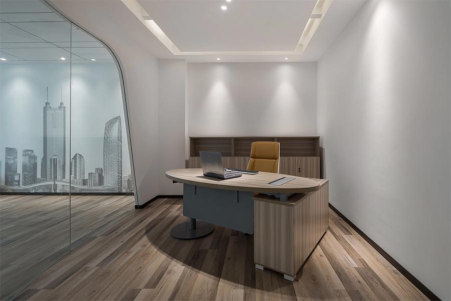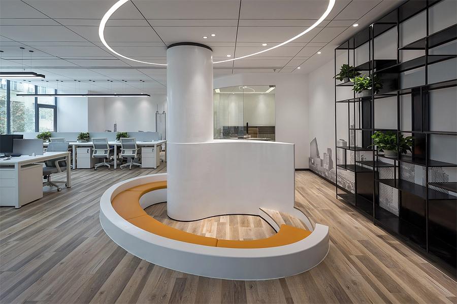 在高效的办公节奏里,松弛感是空间给予团队的隐形关怀。办公区一隅的弧形休闲卡座,以白色与暖橙色的柔和碰撞打破空间单调,围绕立柱设计的流线型座椅,既是员工短暂休憩的充电站,也可作为小型非正式沟通的场所;一旁的通透隔断旁,简约吧台式洽谈区则让交流不必受限于会议室的严肃语境,让创意在轻松氛围里自然流动。而独立办公室的设计更显质感:浅木色办公家具与城市剪影玻璃相衬,既保留了管理者的私密办公需求,又以通透感避免了空间的闭塞 —— 每一处收口的精细处理,每一块材质的拼接误差控制,都彰显着四川壹西格玛在成都本地施工中积累的工艺沉淀,让精致成为空间的日常底色。