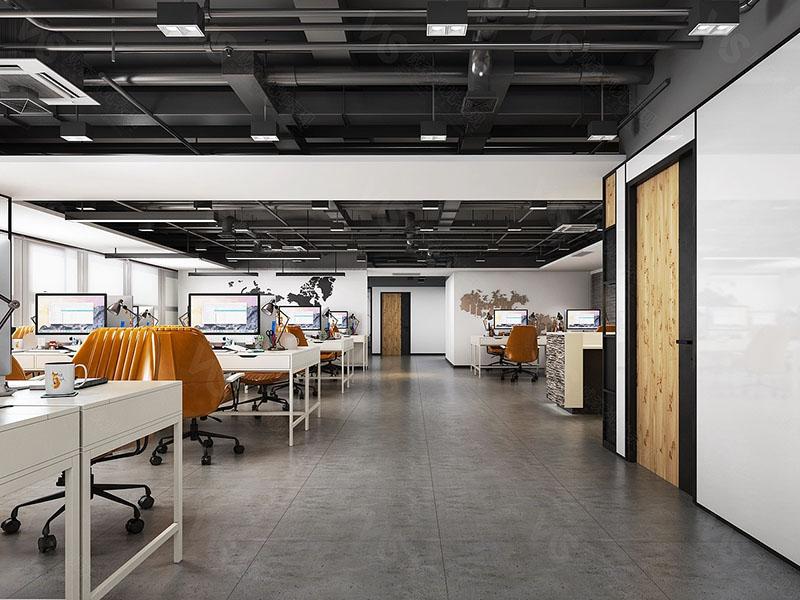 开放办公区是企业活力的集中展现,壹西格玛在此区域的设计中,将工业风的粗犷质感与轻奢风的细腻质感巧妙融合。深色水泥地面搭配裸露的黑色吊顶管道,尽显工业风的随性与大气;而白桌与橙色办公椅的经典搭配,搭配精心布置的绿植与嵌入式灯光,不仅让空间开阔通透,更有效缓解办公疲劳,提升员工工作效率。