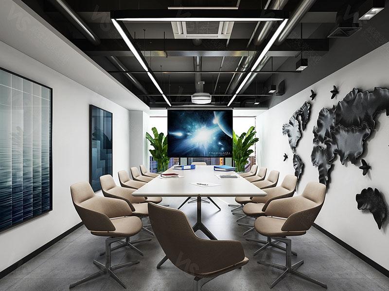 会议室作为团队协作的核心区域,壹西格玛以简洁专业为设计核心,长桌搭配简约座椅,保证了空间的实用性与包容性。墙面装饰的立体世界地图,既丰富了视觉层次,又传递出企业的全球化视野,搭配高清大屏设备与绿植点缀,让会议室成为高效沟通、激发创意的理想场所。