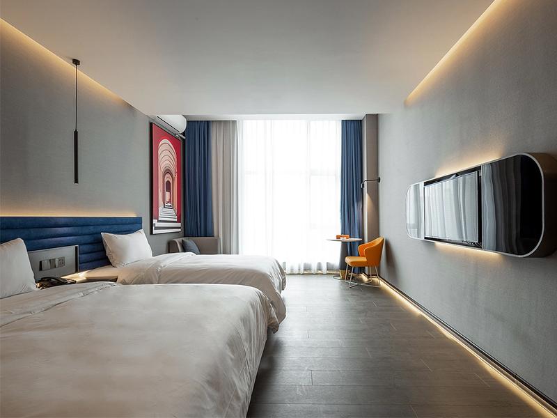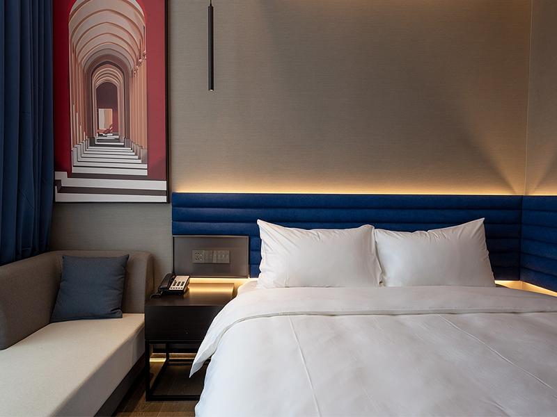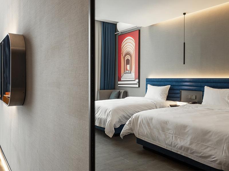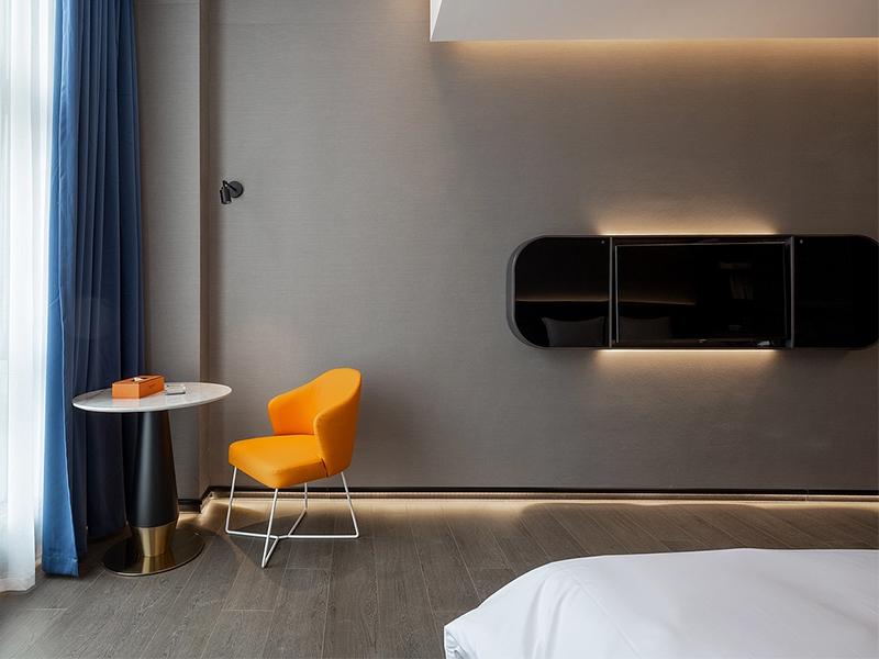 这种设计从不是 “为了好看而好看”,而是让美学服务于体验:壁挂式收纳柜藏起琐碎,只留利落的线条;几何建筑装饰画既是视觉落点,也是空间风格的 “暗线”,让大堂与客房的气质形成呼应;线性灯带沿着墙面、地面生长,既柔化了硬质材料的冷感,又悄悄拓宽了空间的纵深感。连最容易被忽略的细节里都藏着巧思 —— 沙发床兼顾了休憩与实用,小圆桌刚好容得下一杯咖啡与一部电脑,床品的柔软则让视觉的精致落回 “住得舒服” 的本质。
