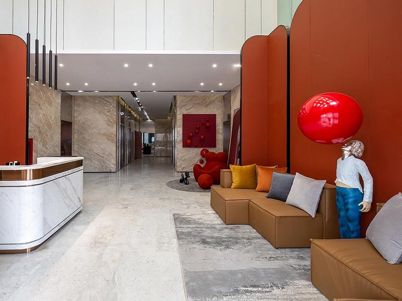 在当下的空间设计语境里,“壹西格玛” 的装修风格正以一种 “克制的鲜活”,重新定义着商业空间的美学表达。它从不让色彩成为视觉的负担,而是像调配颜料般,将复古红、群青蓝、薄雾灰这类看似跳脱的色调,揉进空间的肌理里。大堂里,复古红的弧形软包墙与米棕沙发撞出松弛的艺术感,红色球形装置像一颗 “情绪锚点”,让硬朗的大理石前台多了几分生动;客房中,薄雾灰的墙面是温柔的底色,群青蓝软包床头裹着暖光灯带,爱马仕橙的单椅则成了恰好的提亮,既不会抢走空间的静谧,又让视觉有了呼吸的落点。