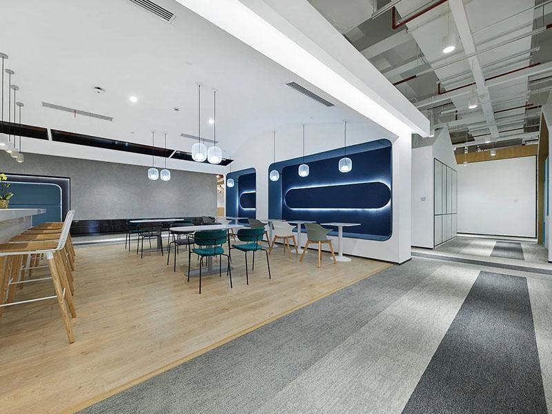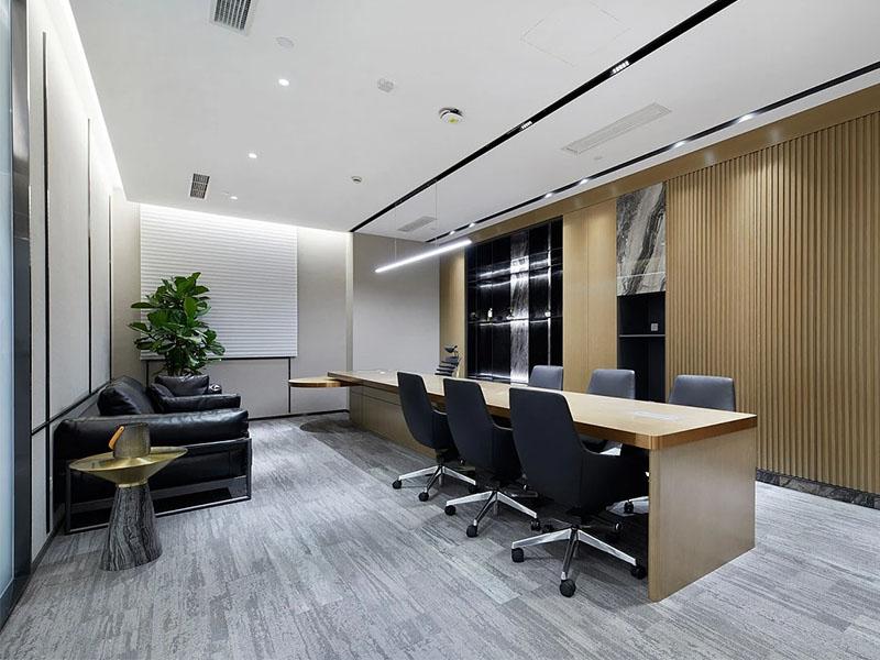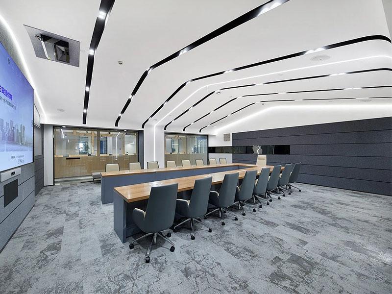 会议区把 “实用” 刻进了细节里:曲线灯带缠在木饰面墙上,大会议室能扛得住路演,玻璃隔断一推就能扩成开放空间;小会议室像 “快充仓”,推门就能抓个角落头脑风暴。最惊喜的是休闲区,咖啡吧、茶水间、活动区直接三合一 —— 木色吧台配马卡龙色座椅,社牛能在这儿开聚会,社恐也能窝进卡座放松,连洗手间都藏着轻奢感:颗粒肌理墙衬着发光椭圆镜,把 “职场人的体面” 焊在了每一处。