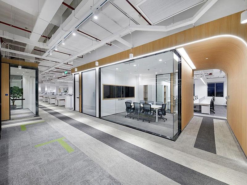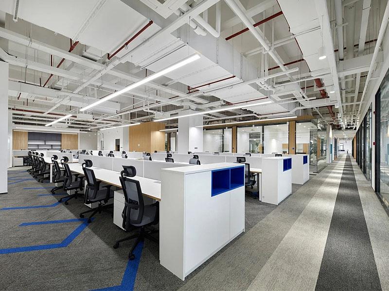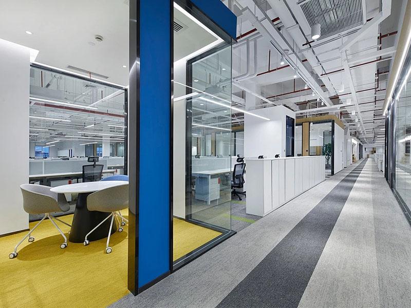 一进门就被前厅的极简感戳中:白色调裹着曲线灯光,大尺寸石材地面衬得空间像美术馆,转身撞见弧形木饰面的小会议室,暖光一透,刚硬工业风里瞬间漫开温柔。开放办公区更绝,成排工位用蓝白分区,裸露的管道配长条形灯带,是职场的利落;地面那抹蓝色线条是 “隐形动线”,玻璃隔断让光顺着故宫式的环形布局淌满整个空间,抬头是工业风的酷,低头是协同办公的顺。