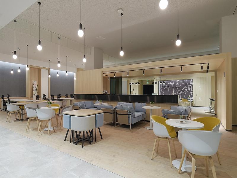 为了避免空间过于 “柔和” 而失了专业度,设计中加入了深灰色墙面与黑色金属元素:开放办公区的背景墙选用低饱和度的深灰,既衬出工位的整洁,也能作为拍摄布景的 “中性背景板”;桌架、装饰条等细节处的黑色金属,则为空间注入了利落的现代感。而点缀其中的亮黄色休闲椅,成了空间的 “情绪开关”—— 跳跃的色彩既呼应了新媒体行业的活泼属性,又不会打破整体的和谐,让会议室、洽谈区多了几分轻松的创作氛围。