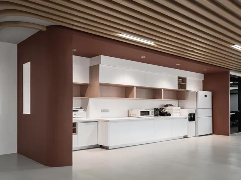 - 公区嵌入茶水间(配冰箱、微波炉),并以波浪形木质吊顶柔化顶部线条,让取餐、休憩的动线自带 “咖啡馆式” 松弛;