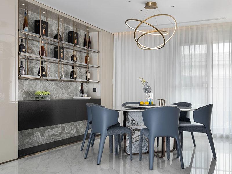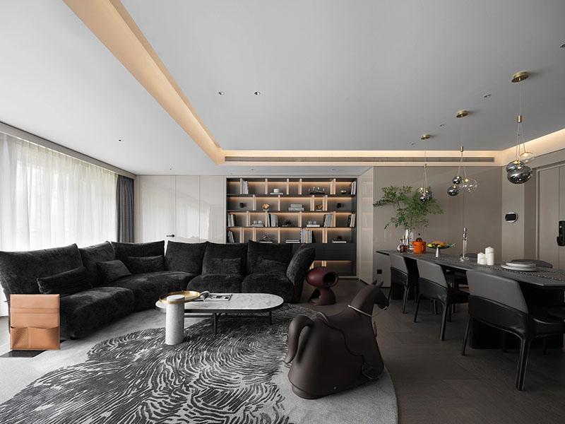 公共区域治愈感拉满,客厅黑色毛绒沙发搭配大理石地毯,是绝佳打卡点。壹西格玛装修设计选用嵌入式灯带开放书架,通透又能收纳民宿用品与装饰。木马摆件、条纹单人椅增添俏皮感,打破沉闷。餐厅黑色餐桌配精致吊灯,酒柜展示区拉满轻奢格调,适配家庭聚餐与情侣小酌,北极熊坐垫更添放松氛围。