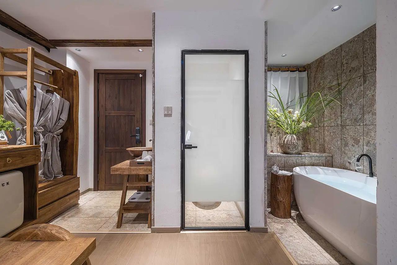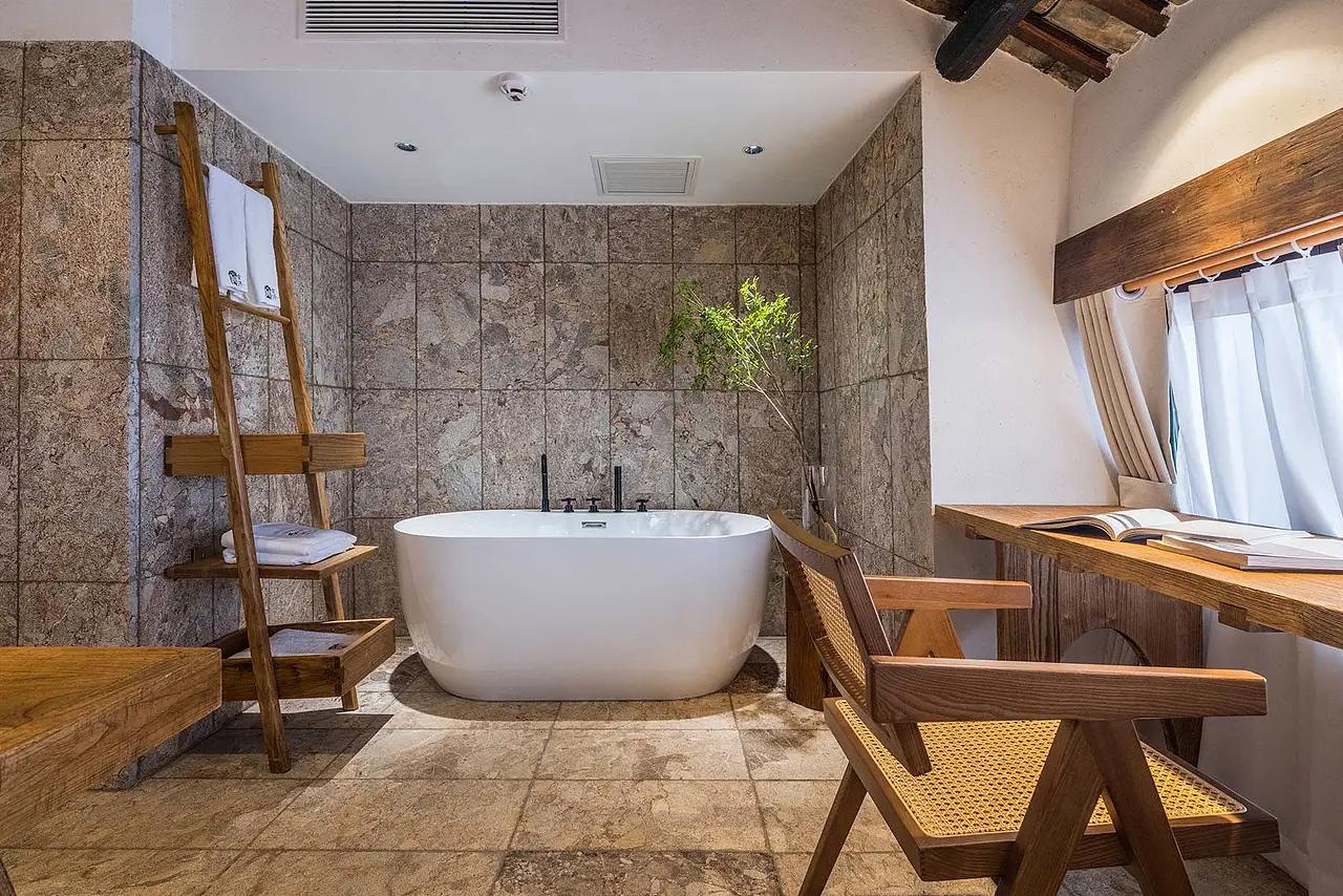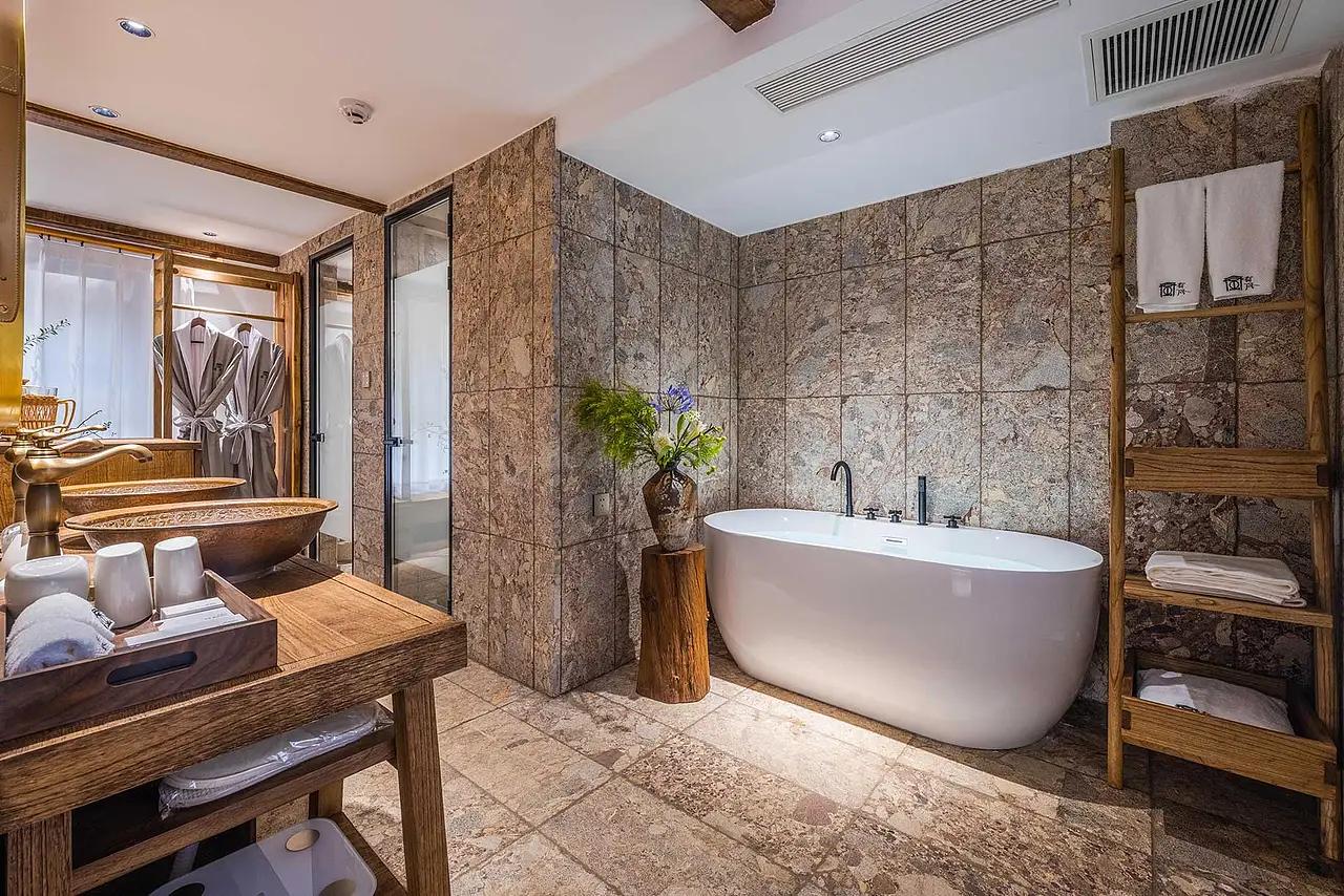 老石屋的 “硬”,需要柔软的材质来平衡。在 1200 平的空间里,设计团队用 “材质混搭”,让粗犷的石屋长出了松弛感:基底是 “野”:石墙、石材地砖延续了山野的厚重,卫浴区的大理石纹瓷砖,也呼应着青城后山的自然肌理;调和是 “柔”:老木家具带着岁月的温润,棉麻质地的沙发、床品,以浅灰、米白的色调包裹住空间的冷硬;