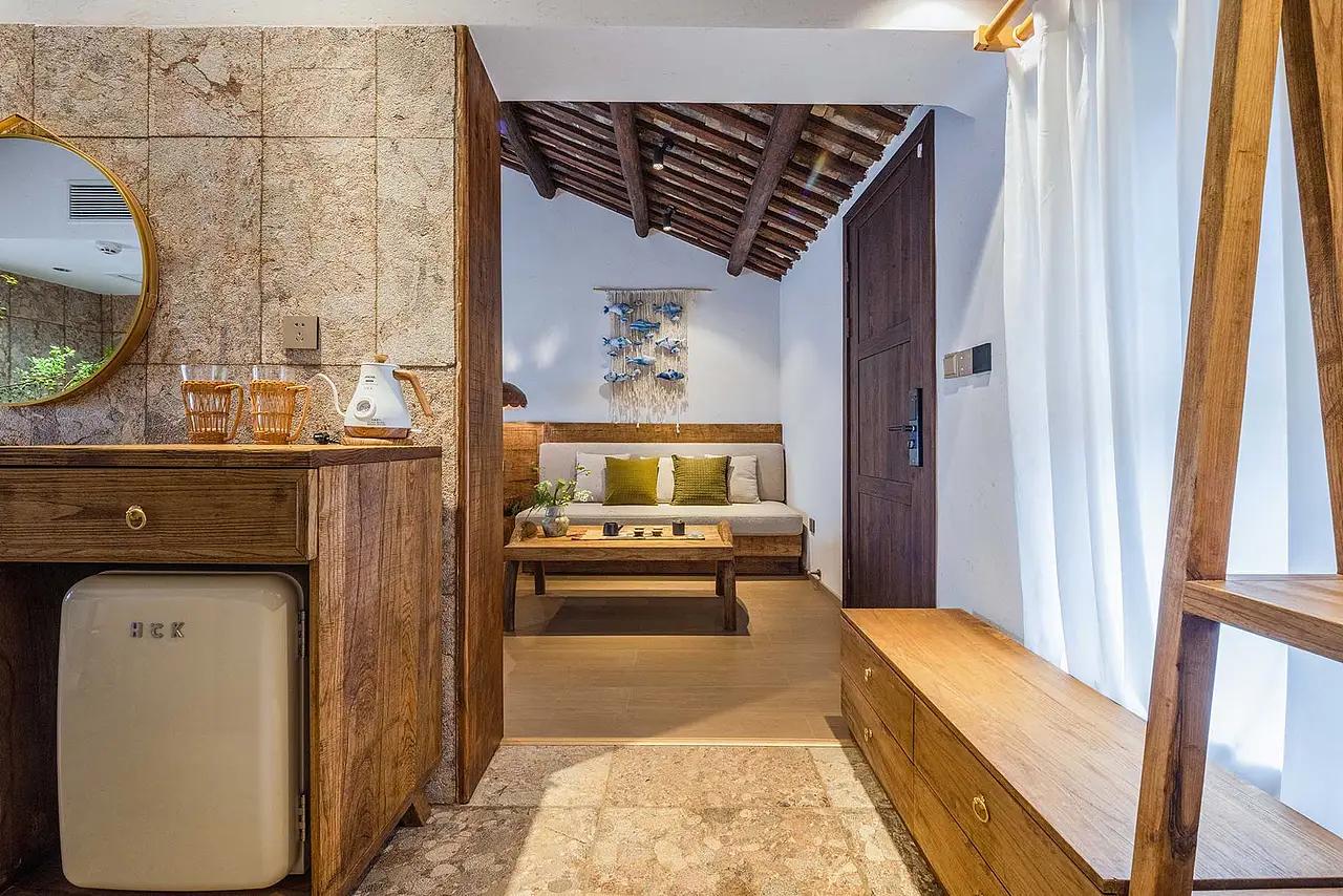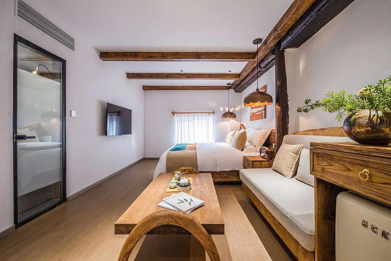 屋顶的木构架没有被吊顶遮蔽,深色的旧木梁与浅色的白墙形成对比,既保留了老建筑的结构记忆,又让层高显得开阔通透;连门框、窗框都沿用了老木材质,带着自然的结疤与纹理,推开门时,仿佛能摸到几十年的山野风。
