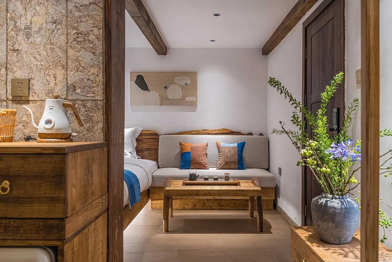 这栋民宿的基底,是青城后山当地留存数十年的石砌老建筑 —— 裸露的石墙带着风雨侵蚀的粗糙纹理,屋顶的旧木梁、屋瓦还留着木质的斑驳与烟火气。在装修设计中,团队没有用 “翻新” 掩盖这些 “不完美”,反而让它们成了空间的灵魂:入户处的石墙直接裸露,石块的凹凸与色差,成了无需修饰的 “天然背景墙”;
