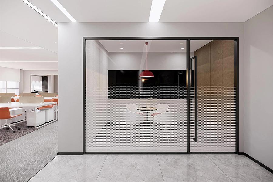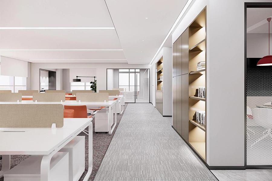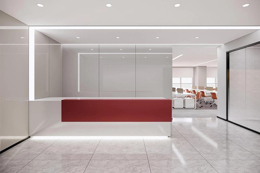 踏入这片精心打造的空间,极简风前台率先勾勒出企业的专业气质,红白撞色搭配哑光金属线条点缀,利落轮廓中透着精致感,通顶玻璃与嵌入式灯光交织出通透开阔的视觉体验,既稳稳承载着企业的第一印象,也以开阔视野消弭了空间的局促感,抬眼便能瞥见后方开放办公区的有序氛围与鲜活气息。毗邻前台的开放办公区以浅色调为基底,米白工位与橙色座椅形成柔和且有张力的视觉节奏,科学的工位布局兼顾动线流畅与个人空间,穿孔玻璃隔断既保障了各小组的区域隐私,又让自然光线自由穿梭于空间之中,让协作交流与专注工作得以巧妙平衡;一侧的内嵌式书架搭配暖调氛围灯,整齐陈列的书籍与摆件既是实用收纳区,也成了空间里的人文质感点缀,让冰冷的办公场景多了几分温润温度。