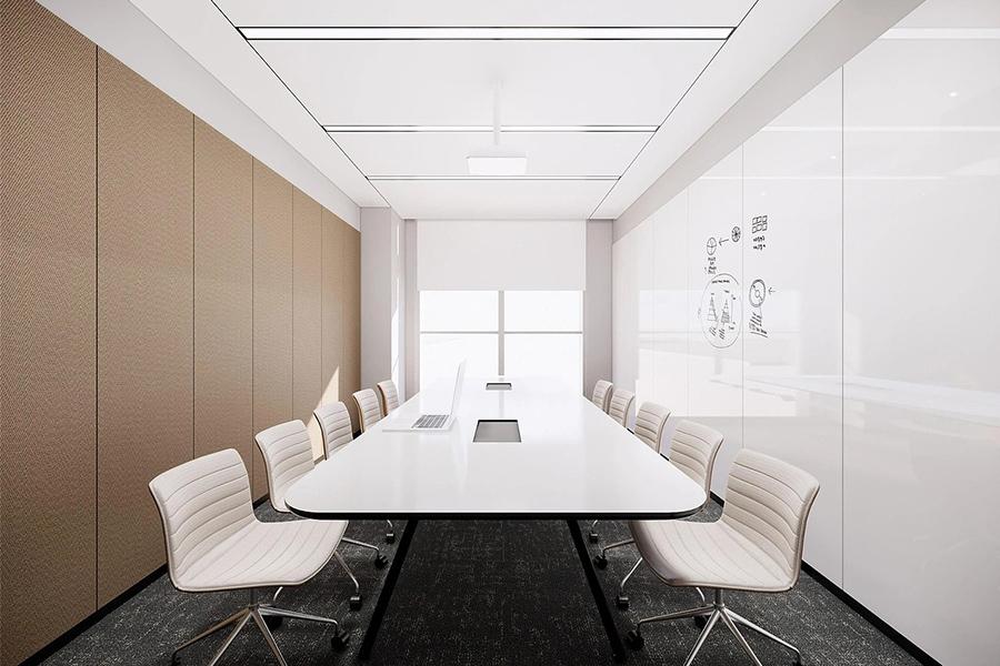 紧绷的工作节奏里,休闲区是恰到好处的"缓冲带"——浅灰布艺沙发、简约岩板茶几与饱满的橙色墩子相映成趣,落地灯的暖光裹着琴叶榕、龟背竹等绿植的生机,柔软的地毯隔绝了外界喧嚣,在这里的片刻休憩、茶水闲谈或是思路碰撞,总能让疲惫消散、灵感重新流动。独立会议室则以素净墙面搭配可书写白板,长形实木质感会议桌与人体工学座椅适配高效沟通,墙面的布艺软包材质既弱化了空间的冷硬感,也有效提升了声学体验,避免回声干扰;而经理办公室将办公与接待功能融于一体,极简实木书桌、嵌入式收纳柜与休闲沙发有序排布,线条利落的吊灯与窗边绿植、轻柔纱帘呼应,既彰显商务格调,又让洽谈交流多了几分松弛的专业感。