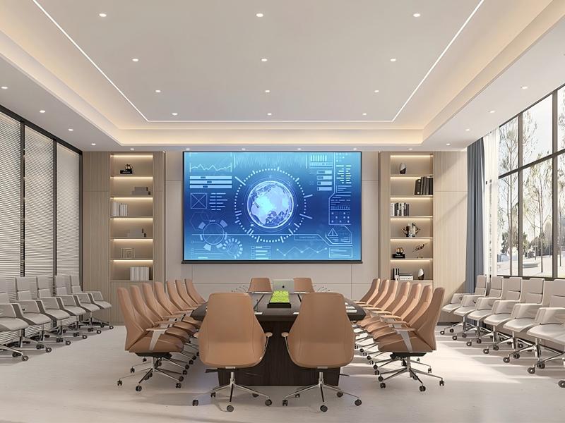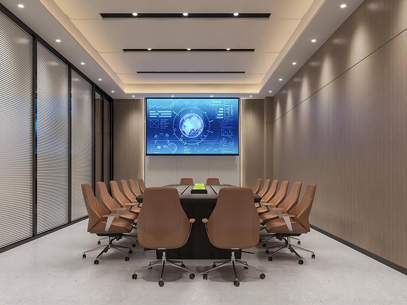 移步至开放办公区,灰白与木色的低饱和搭配,消解了职场的紧绷感:长形工位有序排布,人体工学椅的弧度承托着高效协作的日常,中式山水装饰画晕开一抹东方雅致,几株绿植在晨光里舒展,让办公节奏也随之松弛下来。而大型会议室的设计,则是科技与专业的具象化表达:浅色调空间里,长桌与皮质座椅延伸出规整的秩序,嵌入墙内的大屏跃动着数据界面,嵌入式灯光与简约置物架的组合,让每一场会议都兼具高效与沉浸感;另一间小型会议室则以木饰面墙面裹住静谧,同样的智能屏与舒适座椅,适配更私密的沟通场景。