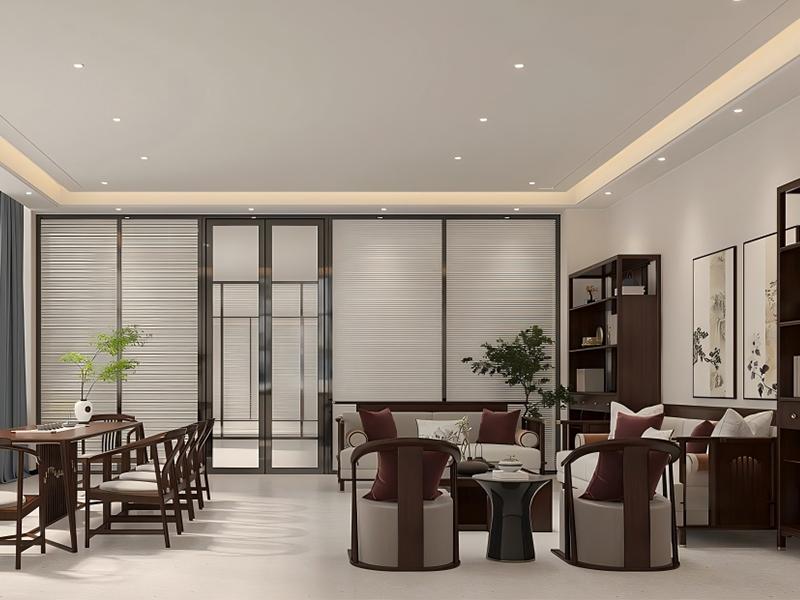 最是休闲区藏着巧思,新中式元素在这里与现代美学达成和解:深木色框架裹着浅软布艺,水墨装饰画在墙面上晕开留白,绿植与摆件错落成景,既承接着商务洽谈的功能,也能让紧绷的工作节奏在此处慢下来。