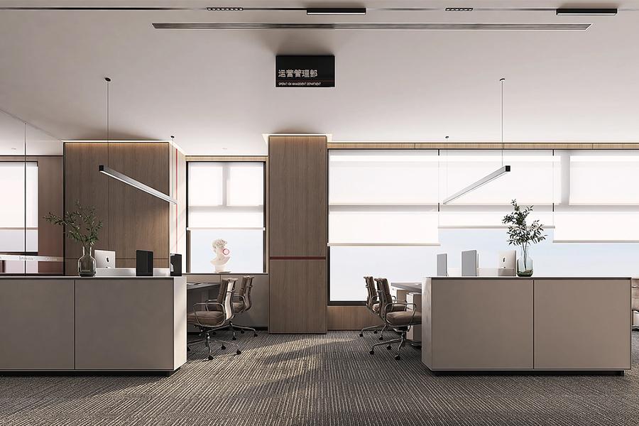 功能分区的精细化设计,更彰显四川壹西格玛对企业实际需求的深度洞察。运营管理部、品管部、财务部等不同职能部门,以半通透木饰面隔断自然界定空间边界,搭配简约清晰的标识牌,既明确传递功能属性,又不割裂整体空间的通透感,为各部门预留独立工作节奏的同时,避免封闭空间的压抑感。针对部分需要高度私密的办公场景,采用弧形玻璃隔断搭配百叶帘设计,在保障机密工作安全性的前提下,借由材质通透感让光线自由流通,实现专注与开放的动态平衡。