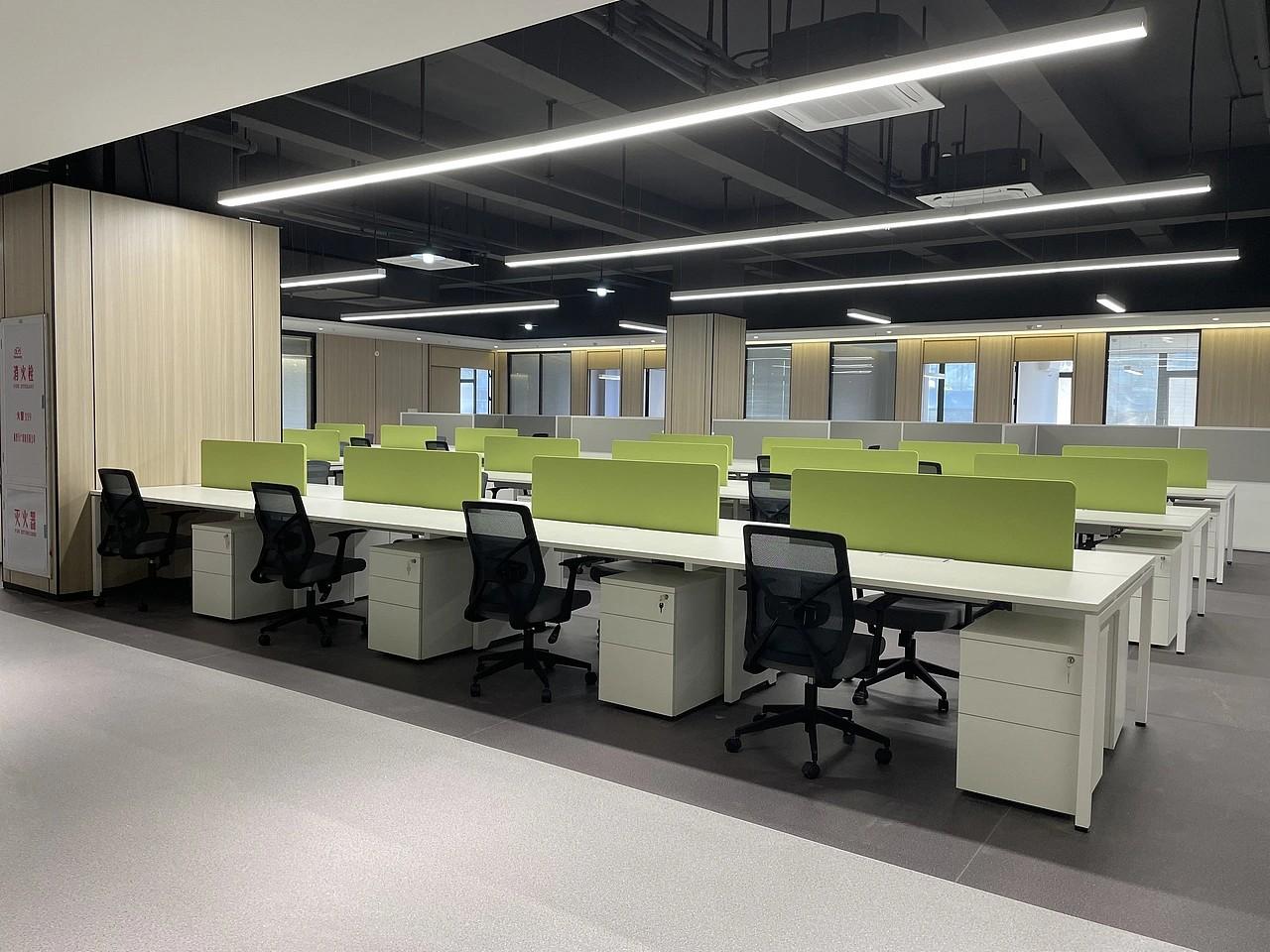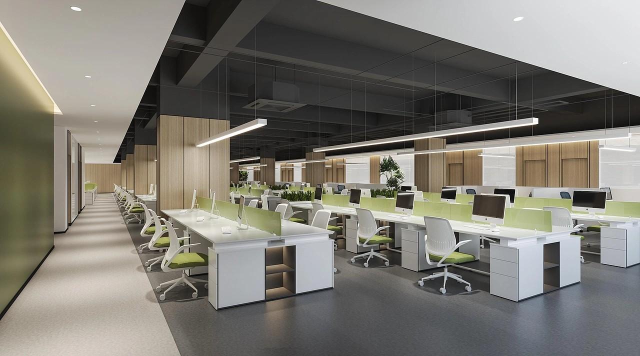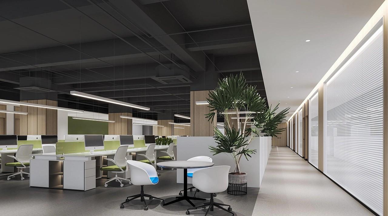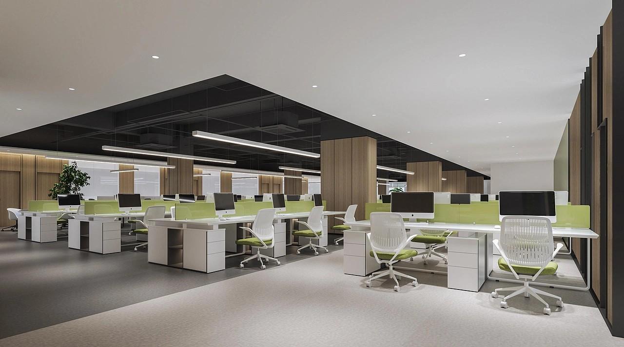 开放办公区作为员工日常工作的主要场所,设计上深度适配了新媒体行业的协作需求与工作节奏。空间采用“浅白+原木+活力绿”的多元配色方案,浅白与原木色奠定了沉稳的商务基调,少量活力绿的点缀则有效缓解了新媒体从业者高强度工作带来的视觉疲劳,让办公环境更具生命力。区域内采用模块化工位搭配定制收纳柜的组合形式,低矮隔断既保证了员工的独立工作隐私,又不阻碍团队间的即时沟通,极大提升了2000平空间的利用率。顶部采用当下流行的裸露式黑色顶设计,搭配长条形吊灯,通过工业风轻改造的设计手法,在控制成本的同时,营造出极具高级感的工业美学氛围。此外,空间内合理布局了绿植景观与小型洽谈区,绿植不仅改善了室内空气质量,更增添了自然生机;小型洽谈区则为团队临时沟通、创意交流提供了灵活场所,实现了工作与休憩的无缝切换。