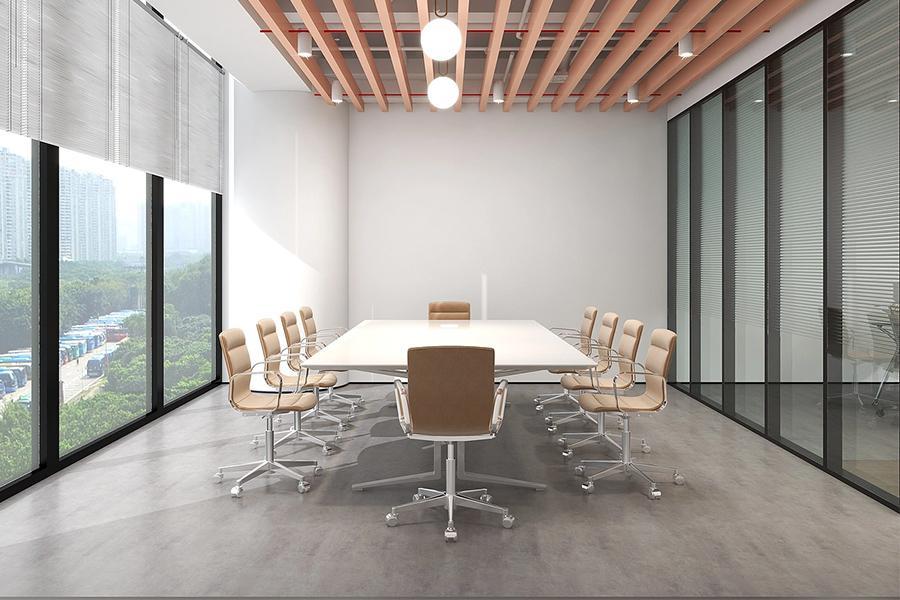 往内行进,核心会议区是 “专业与通透” 的代名词。整面落地玻璃将金牛区的城市绿意与建筑轮廓纳入室内,自然光与球形吊灯的暖光交织,让每一场讨论都浸在舒适的氛围里。简洁的白色会议桌搭配质感皮质座椅,既满足了多人协作的功能性,又以低饱和度的色调保持了空间的整洁与专业 —— 即便是严肃的商务洽谈,也能在开阔的视野与柔和的光线里,消解不必要的紧绷感。