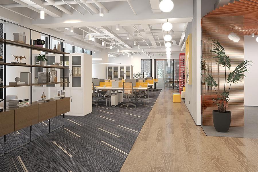 开放办公区是效率与温度的平衡场。深浅交织的地毯弱化了空间的空旷感,统一的办公家具保持了视觉的整洁,而点缀其中的黄色元素则为理性的工作场景增添了几分活力。置物架上的艺术摆件与书籍,让办公区不止于 “工作”,更成为员工可以感知审美与趣味的场所 —— 比如那幅带着 “Zzz” 的狮子装饰画,悄悄消解了职场的紧绷感;而充足的储物空间与灵活的工位布局,又让团队协作与独立工作都能各得其所。