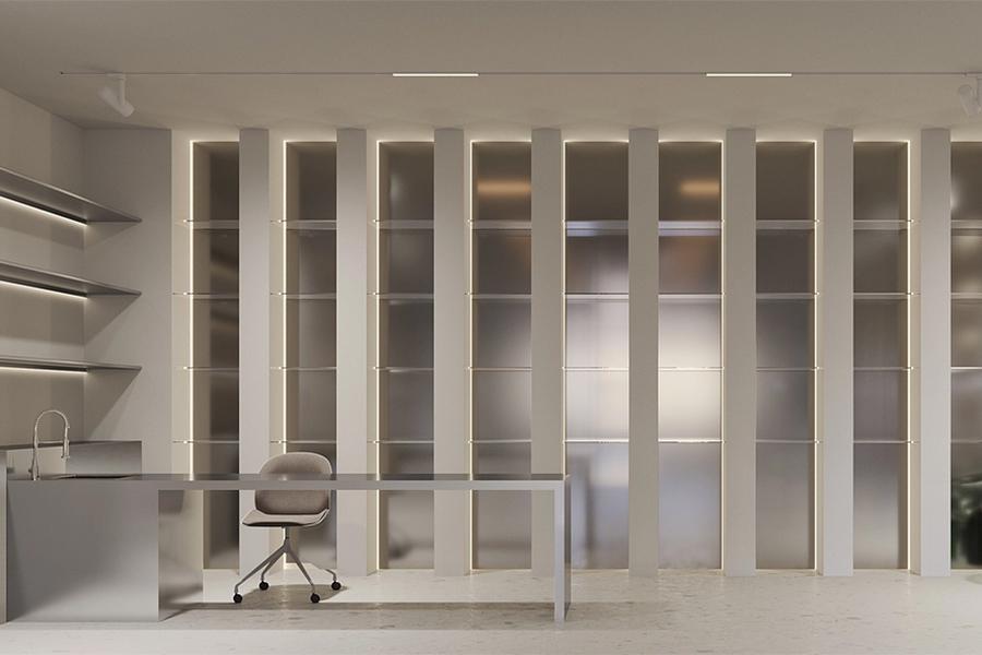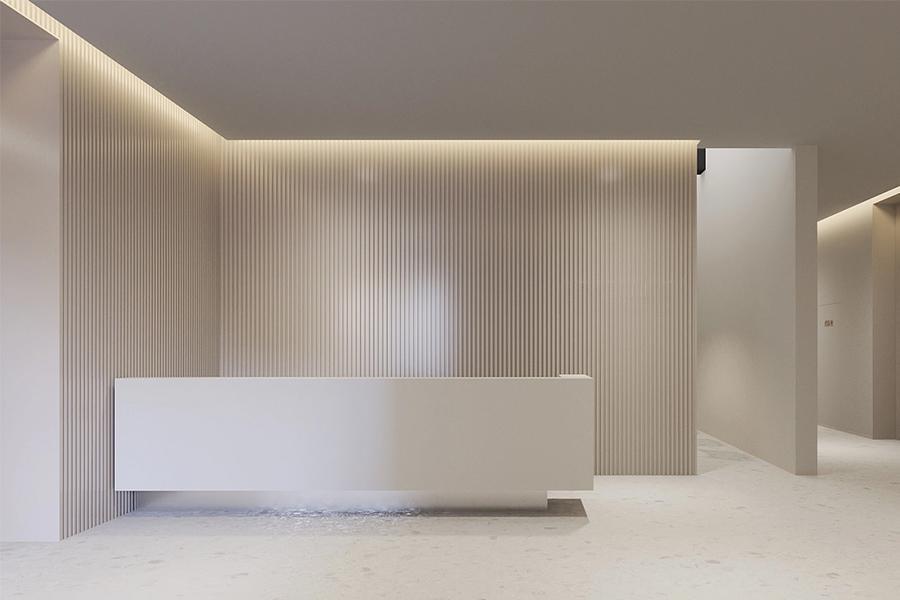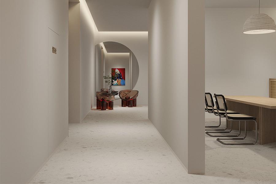 踏入空间的第一步,极简主义的前台便铺展开高级质感 —— 竖向纹理的墙面在嵌入式灯光的晕染下,勾勒出柔和却不失力量的轮廓,浅米色的一体成型接待台消解了传统办公空间的刻板,让访客的第一印象便落足于 “松弛的精致”。沿动线深入,走廊以利落的线条与柔和的弧形元素形成对话,浅色调的墙面衬着艺术画作与通透的门洞,让原本狭长的过渡空间成为了艺术与功能的衔接带,每一步行进都伴随着视觉层次的舒展,即便在商务节奏里,也能感知到空间的呼吸感。