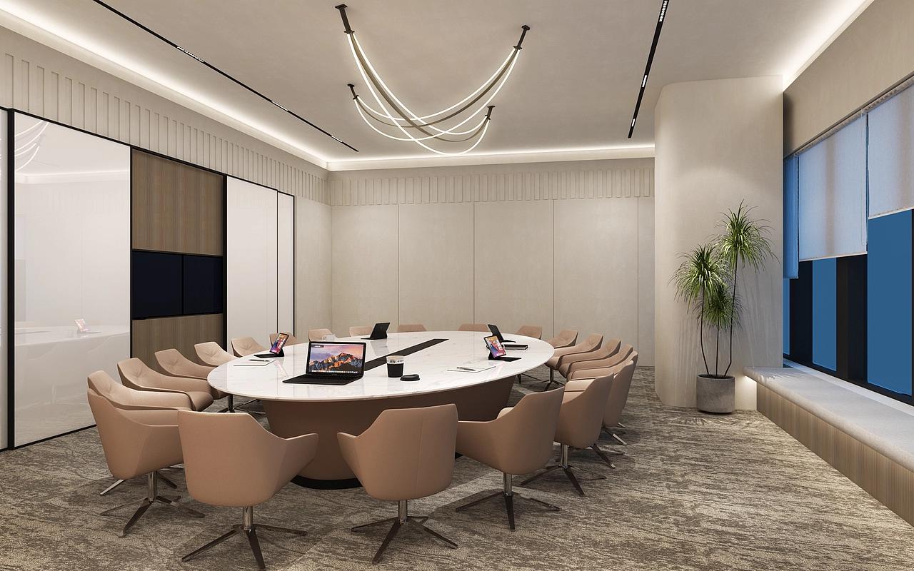 会议室以 “现代商务风” 为主调:圆弧会议桌 + 柔感皮质椅,兼顾了商务沟通的正式感与长时间脑暴的舒适度;隐藏式灯光与局部木饰面提升精致度,落地窗与休闲飘窗引入自然光线,让提案、复盘不再是压抑的 “封闭任务”。