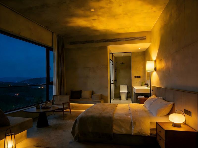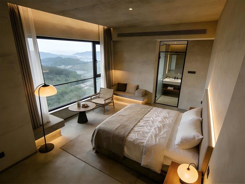 在风格演绎上,壹西格玛尤其擅长侘寂风的当代诠释,就像那间令人心动的山顶套房般,用清水混凝土的原生肌理、原木与棉麻的温润质感,搭配米白、浅棕的低饱和色调,营造出松弛治愈的氛围。他们从不刻意堆砌装饰,而是通过材质的层次碰撞传递本真之美 —— 微水泥墙面的粗糙质感与玻璃砖的朦胧通透相映成趣,原木家具的天然纹理与嵌入式灯带的暖光交融共生,让空间在质朴中透着高级。这种设计理念不仅体现在民宿项目中,更延伸到办公、酒店等多元空间,从现代简约的清爽雅致到轻奢风格的精致质感,每一种演绎都精准契合使用者的需求。