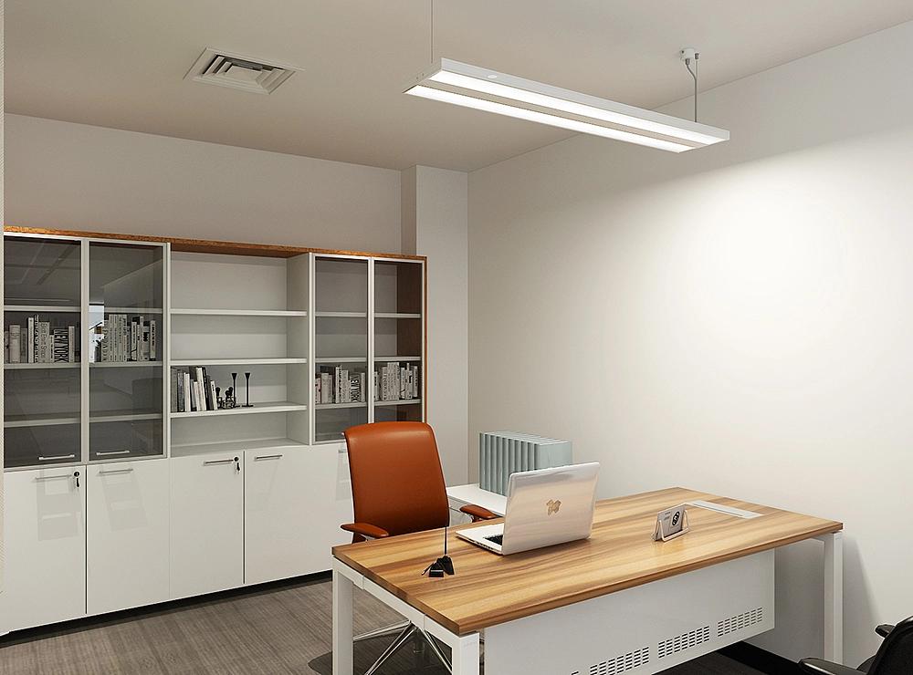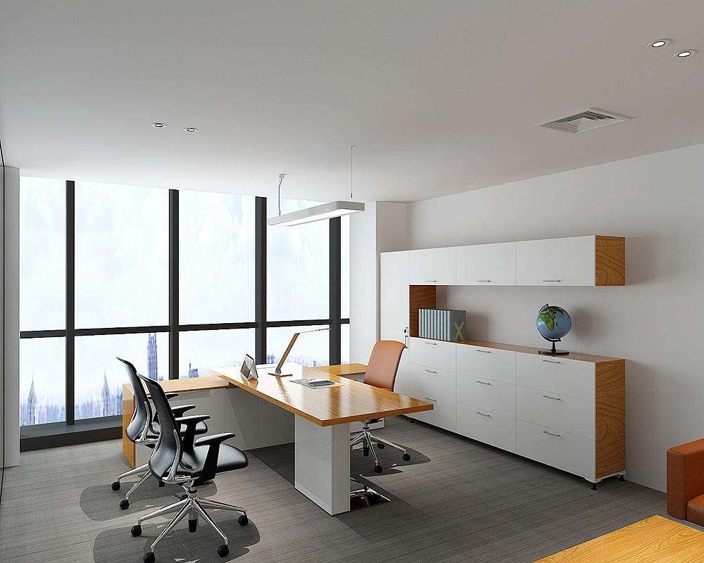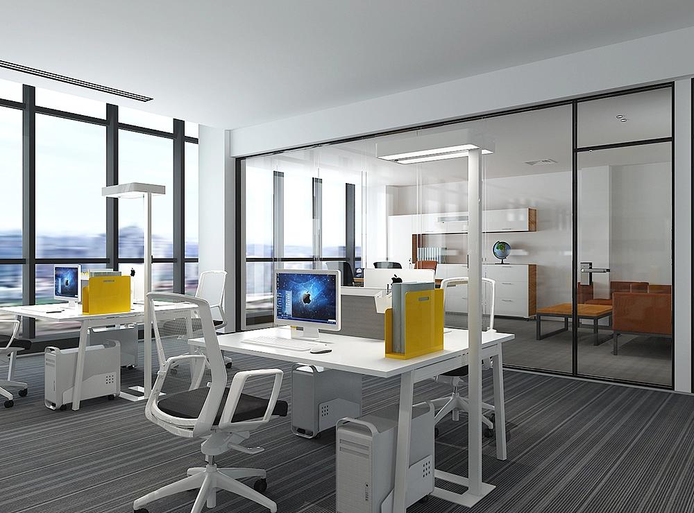 开放办公区作为团队协作的核心阵地,是本次设计的重点区域之一。设计采用长桌搭配半通透工位隔断的布局形式,既为摄影策划、后期修图等岗位提供了相对独立的专注办公空间,又保障了团队成员间的即时沟通与创意碰撞。色彩搭配上以纯净的白、高级灰为基础色调,奠定简洁沉稳的空间基调,同时巧妙融入黄色文件盒、橙色人体工学椅等亮色元素作为点缀,为空间注入鲜活活力,缓解长时间创作的视觉疲劳。设施配置充分兼顾实用性与舒适度,每个工位均标配高性能电脑、储物抽屉与可调节人体工学椅,满足专业工作需求;区域角落点缀绿植盆栽,悬挂简约线条的造型灯具,与大面积落地窗引入的自然光线相得益彰,让整个办公区明亮通透,充满生机。