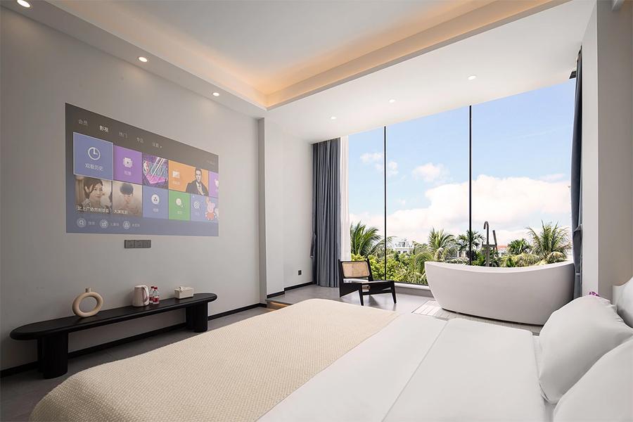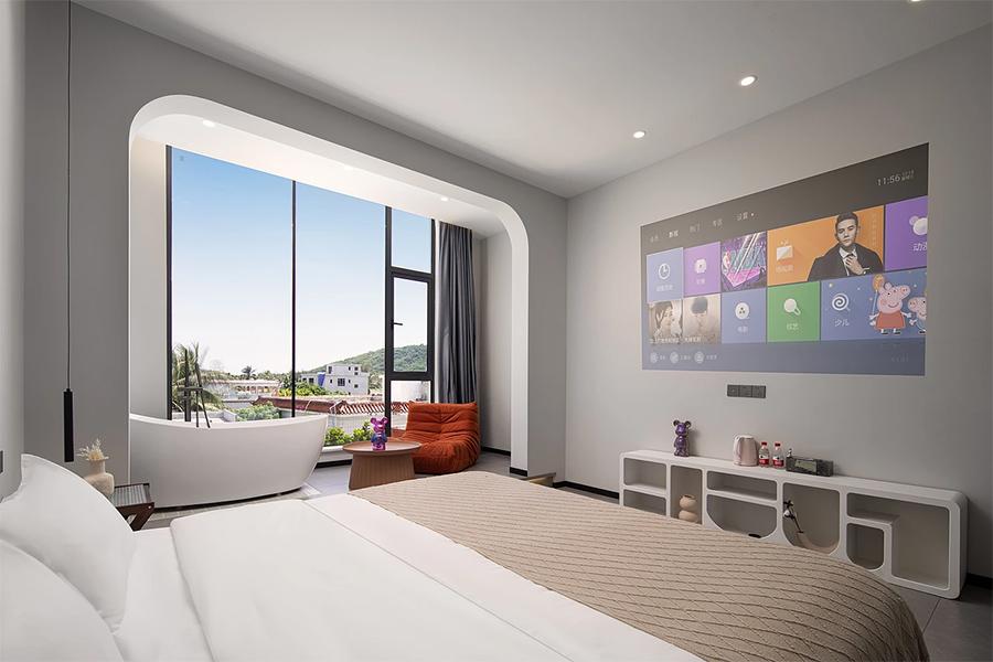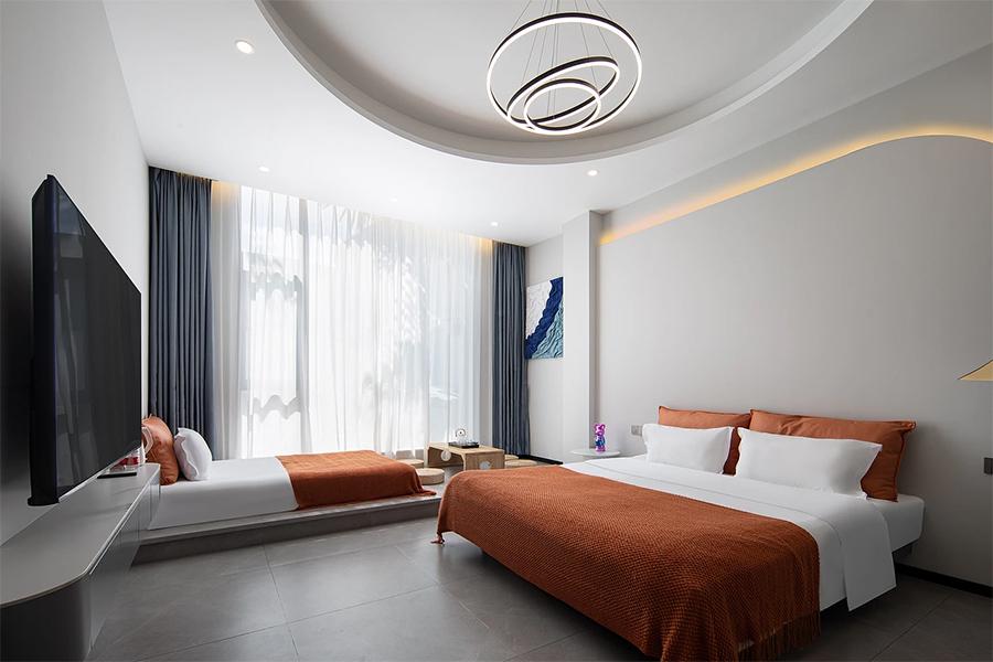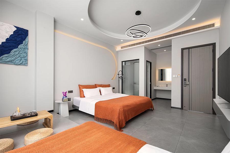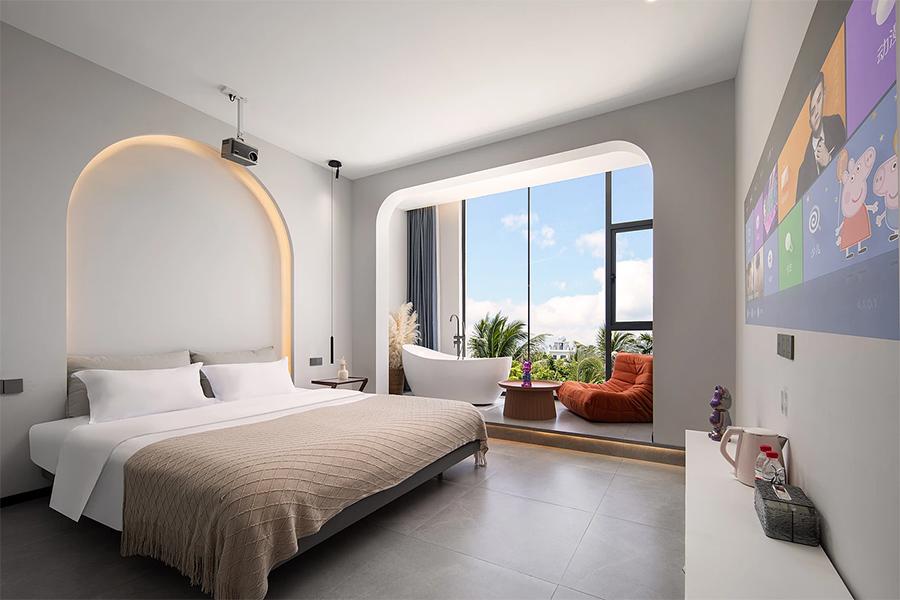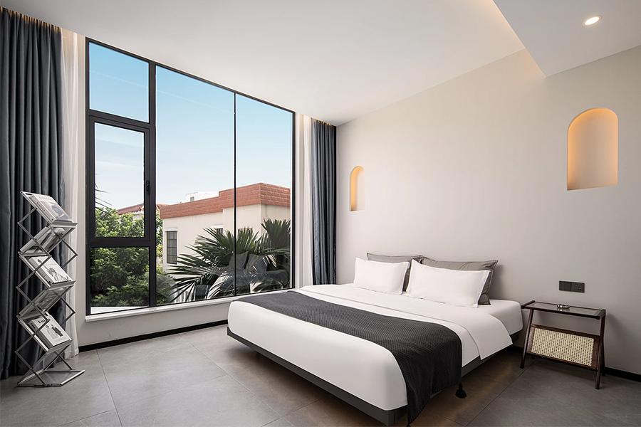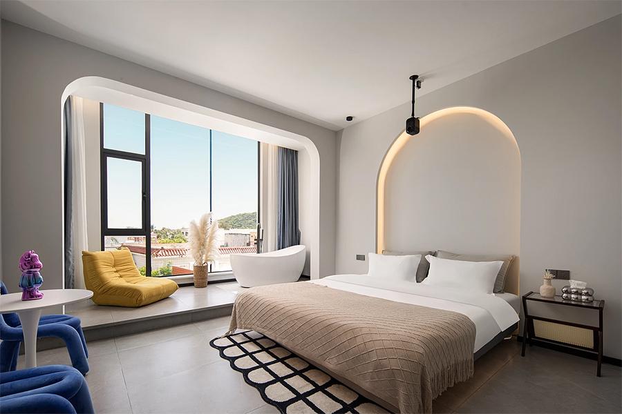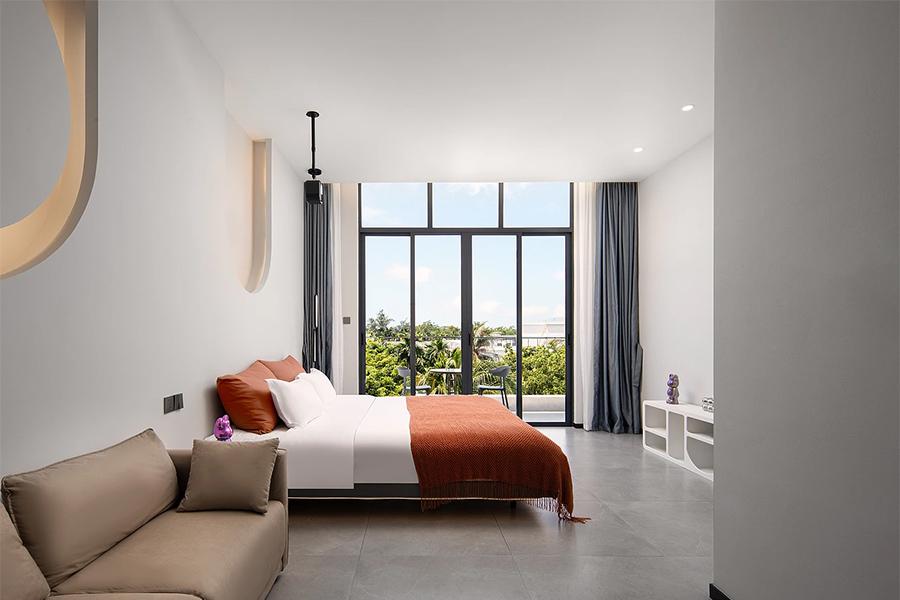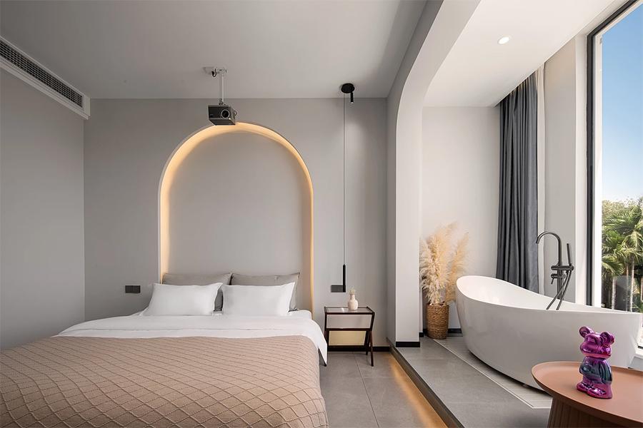 我们认为,好的民宿设计应当回归居住本质。在空间打造上,团队以浅灰、米白为基底色调,摒弃冗余装饰,通过流畅的线条与纯粹的材质,勾勒出开阔通透的场域。拱形床头背景墙嵌入柔和灯带,在极简造型中融入温暖光源,既强化空间层次,又营造出静谧松弛的睡眠氛围;大尺度落地窗将热带椰林与城市烟火引入室内,让自然成为空间的一部分,住客在卧榻之上即可饱览四季更迭的景致。