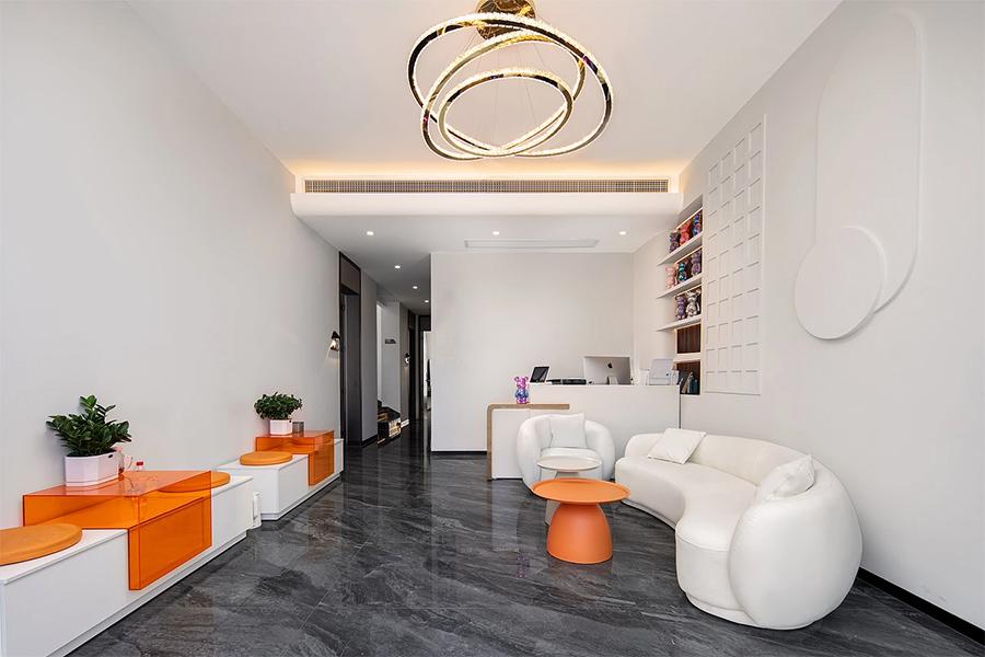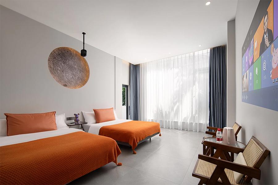 在软装搭配上,我们坚持 “少即是多” 的原则。焦糖色针织床品与姜黄色懒人沙发形成视觉焦点,为极简空间注入温暖活力;藤编家具与干花装置的点缀,增添自然质朴的在地气息;艺术雕塑与月球造型墙面装饰则提升空间艺术感,让每一处细节都成为旅途中的惊喜。针对亲子出行需求,团队特别增设高低床与儿童专属休憩区,在保持整体风格统一的前提下,通过橙色床品与童趣投影,打造安全舒适的亲子互动空间。