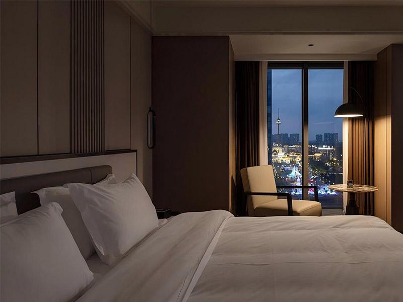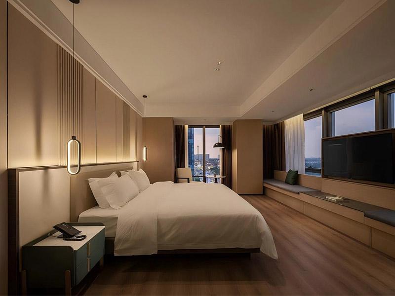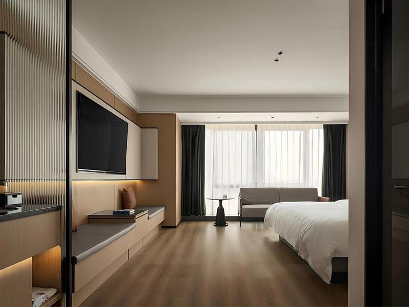 光影与布局的巧思,更彰显壹西格玛对空间的深刻理解。客房采用模块化功能分区,床区、办公区、临窗休闲区边界清晰又自然融合,嵌入式电视与储物空间结合,最大化利用面积的同时保持整洁。隐藏式灯带与简约壁灯、吊灯相互配合,柔光漫过空间,勾勒出家具线条与墙面肌理,让百叶窗滤过的光斑成为空间的灵动点缀。这种对光影的精准把控,让客房在白天通透明亮,夜晚温润静谧,适配休憩、办公等多元需求。