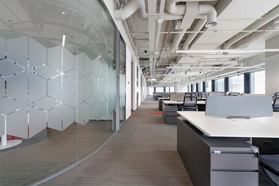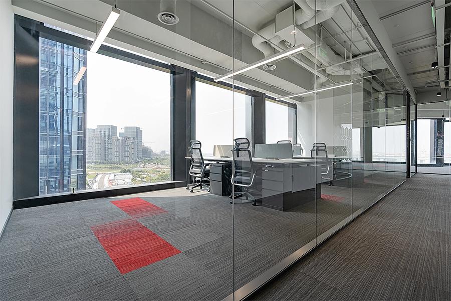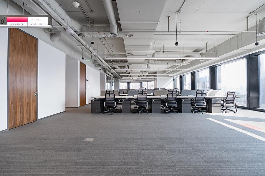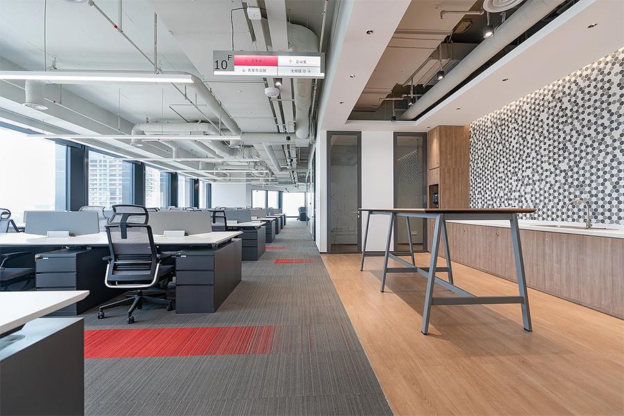 开放式办公区以通透玻璃隔断划分空间,既保障协作效率,又兼顾个人专注。裸露的顶面管线与利落的办公家具形成工业风与现代感的碰撞。红灰拼接地毯在沉稳基调中注入活力,缓解视觉疲劳,激发团队创造力。靠窗工位将城市景观引入室内,自然光与线性照明系统交织,营造出明亮且富有层次的办公氛围。