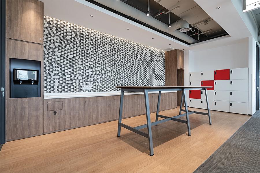 休闲区与水吧台的设计,则为办公场景注入松弛感。几何纹理艺术墙与木质柜体形成视觉焦点,定制长桌与储物柜满足临时协作与收纳需求。红白色块点缀的更衣柜,延续整体空间的活力基因,让员工在工作间隙获得舒适的放松体验。