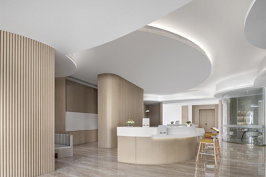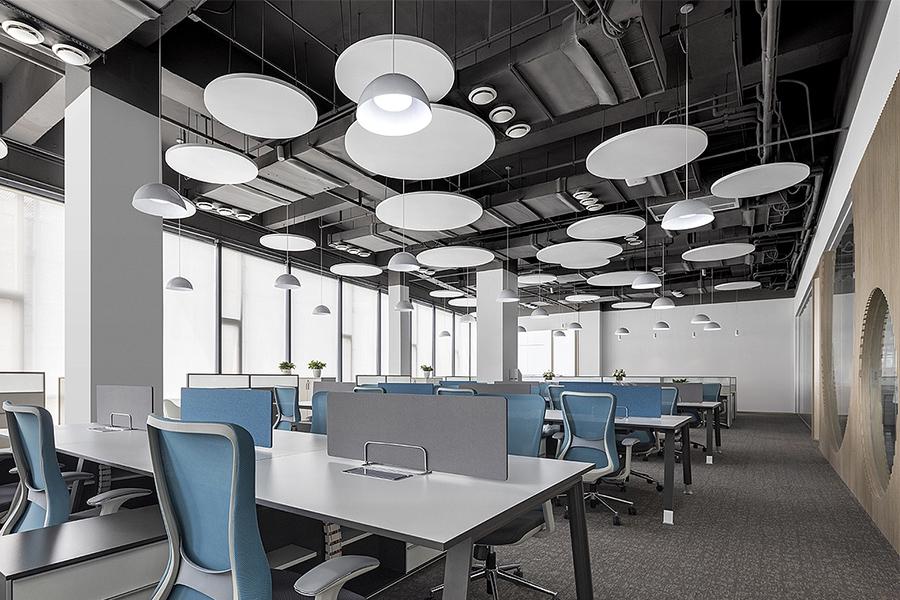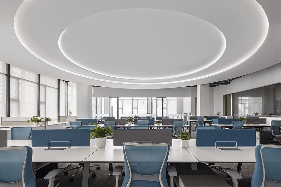 从简约大气的前台接待区开始,我们以浅木色的竖向格栅与弧形线条构建空间韵律,搭配温润的石材地面与柔和的嵌入式灯光,消解了传统办公场所的冰冷感,营造出兼具仪式感与亲和力的第一印象。步入开放办公区,错落有致的工位布局与半通透的蓝色隔断,在保证协作效率的同时,为员工保留了独立思考的私密维度;顶部的圆形叠级灯带与悬浮式吊灯,既强化了空间的纵深感,又以柔和光线缓解视觉疲劳,让高效办公与舒适体验在此共生。