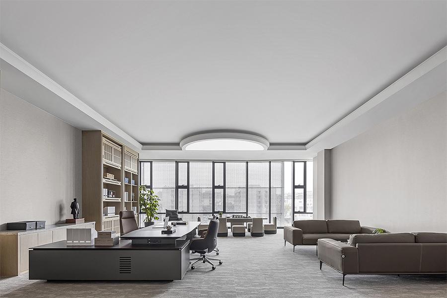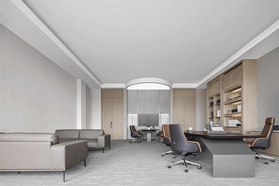 我们同样关注办公场景中的人文关怀:在总裁办公区,以低饱和度的皮质沙发与原木书柜构建沉稳雅致的专属场域,既满足商务洽谈的专业需求,又为管理者提供了静思决策的私密空间;在休闲洽谈区,轻盈的白色座椅与绿植点缀其间,通透的纱帘引入自然光线,让员工在忙碌之余得以短暂休憩,让空间成为情绪的缓冲带与灵感的发酵场。