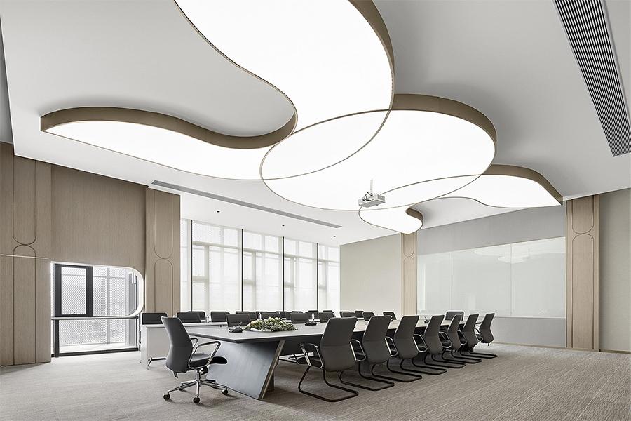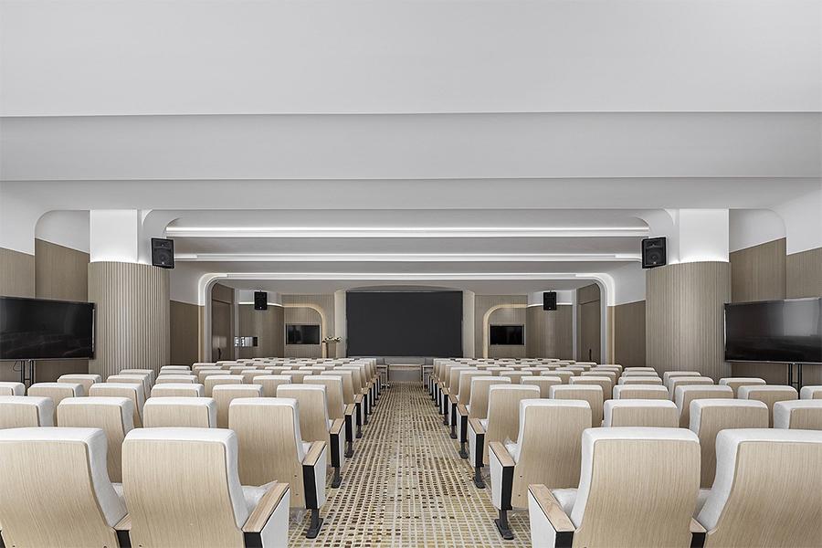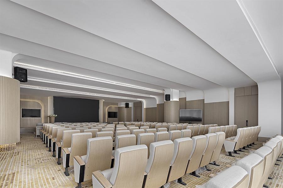 针对企业的核心决策场景,我们打造了多元会议空间:兼具科技感与艺术感的大型会议厅,以流畅的曲线吊顶与智能影音系统,适配千人级别的战略发布与行业论坛;而小型圆桌会议室则通过温润的木饰面与灵动的云朵造型顶灯,营造出平等开放的沟通氛围,让每一场头脑风暴都能在松弛的节奏中迸发灵感。在可容纳数百人的阶梯报告厅内,浅米色的座椅与渐变纹理的地面形成视觉呼应,隐藏式的声学设计与高清显示系统,确保每一次分享都能清晰传递,成为企业链接外界、沉淀思想的重要阵地。