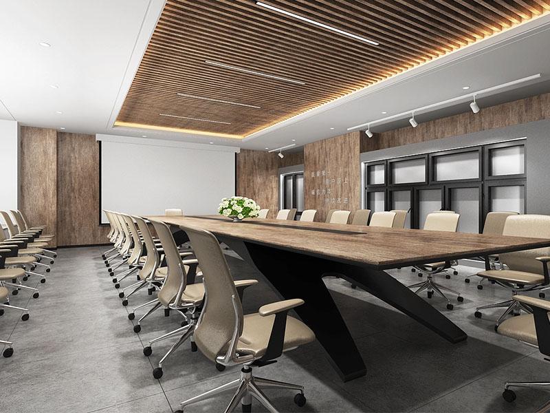 移步至大会议室,长条形实木会议桌与米色办公椅铺展开沉稳大气的商务氛围,墙面与吊顶的木质格栅在暖光灯带的烘托下,消解了大型空间的空旷感,20 人以上的容纳量满足企业大型会议与商务洽谈的双重需求,专业感与舒适感在此达成精妙平衡。