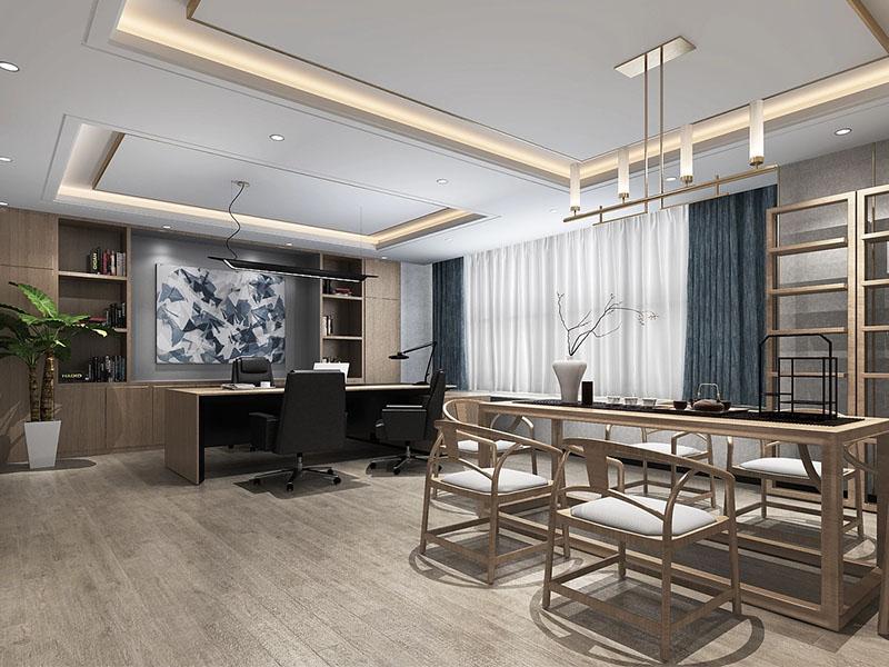作为空间的核心私密区域,董事长办公室则以新中式风格诠释东方底蕴与现代舒适的融合。壹西格玛的设计师将现代简约书桌与中式实木茶桌并置,水墨装饰画与线条感吊灯遥相呼应,既保留了传统空间的雅致气韵,又通过人体工学座椅与智能照明系统,满足现代办公的功能需求,成为高层决策与重要接待的专属场域。