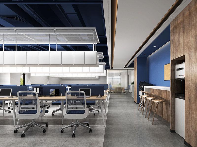 穿过前台,开放办公区以蓝、木、灰构建起通透流畅的协作场域。壹西格玛的设计师们将木质桌面的温暖与蓝色办公椅的活力相融合,搭配金属框架的简约线条,既保证了视觉上的轻盈感,又通过绿植隔断缓解视觉疲劳。紧邻工位的茶水间是设计中的巧思亮点,木质墙面与高脚凳营造出轻松的社交场景,让员工在忙碌间隙拥有放松交流的空间,细微之处尽显人性化关怀。