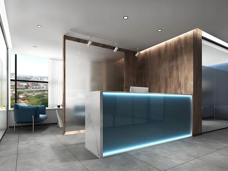 步入项目前台,蓝白渐变的发光台面与温润木饰面形成视觉对话,大理石的冷冽被灯带的柔化线条中和,等候区的蓝色沙发与落地窗的城市景致相映成趣,第一时间传递出专业、现代的企业气质,让访客初入便对品牌留下深刻印象。