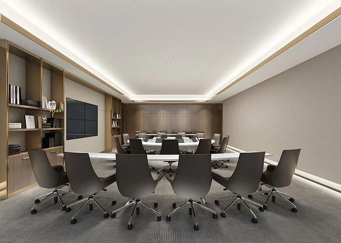 作为团队沟通、技术培训与头脑风暴的核心场景,多功能会议区采用红、灰撞色墙面,极具视觉冲击力。木质格栅吊顶与悬挂式艺术装置,让空间既保持了正式感,又充满了创意氛围。长条桌与围合式座椅的布局,可灵活适配多人会议、技术培训等不同需求,充足的走动空间也让小组讨论更为高效。
