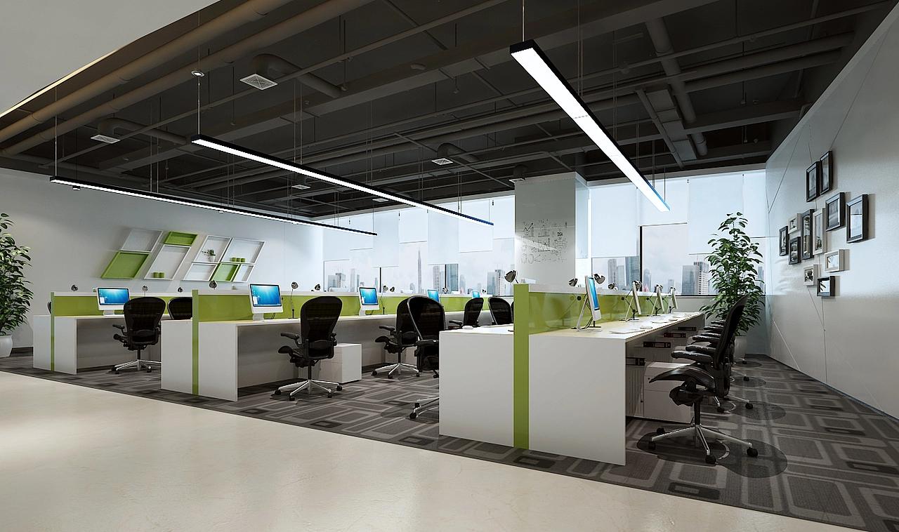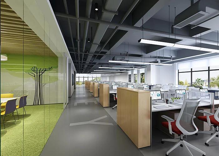 作为研发团队的主要工作区,这里以工业风为基底,采用黑色裸顶设计,将管线与结构自然暴露,搭配白色长条形 LED 吊灯,既让层高优势得以充分展现,也营造出简洁利落的现代感。空间以白、灰为底色,用清新的绿色作为核心点缀,从工位隔断到墙面装饰,再到角落的绿植,形成了层次丰富的视觉系统。这种配色不仅能缓解研发人员长时间面对屏幕的视觉疲劳,更传递出年轻、有活力的团队气质。模块化的开放式工位布局是空间的另一大亮点。矮隔断在划分个人专注区域的同时,保持了视觉通透,让员工随时可以起身交流,契合研发工作中高频协作的需求。地面铺设的几何纹理地毯,既清晰界定了办公区域,又能有效降低行走噪音,为专注思考创造了安静的环境。大面积的落地窗引入充足自然光,搭配简洁的白色墙面,让整个空间明亮通透,窗外的城市景观也成为了办公场景中的一抹亮色。