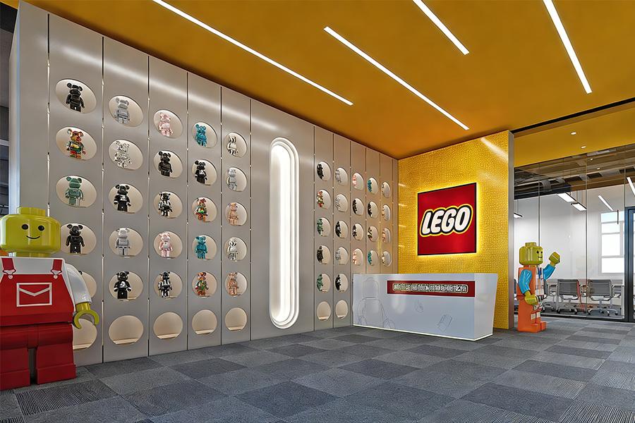 步入前厅,乐高主题的艺术装置打破了传统办公的严肃感,色彩明快的巨型人偶与满墙的积木手办,在暖黄色的顶面灯光下形成极具记忆点的视觉符号。这种沉浸式的场景设计,不仅传递出企业开放创新的品牌基因,更让每一位来访者在踏入空间的瞬间,就能感知到团队的活力与创造力。我们深知,前厅是企业的第一张名片,因此在设计中既保留了空间的通透秩序感,又通过主题化的艺术表达,让品牌形象在细节中自然流露。