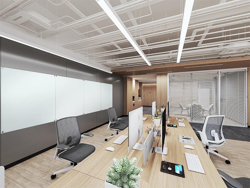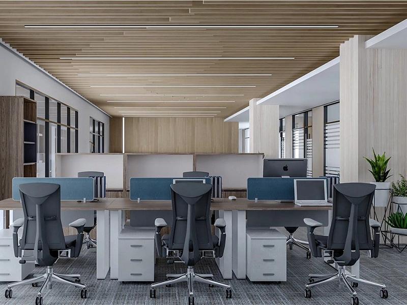 设计亮点聚焦光影营造、细节处理与通透感塑造,彰显公装设计的精细化水准。光影设计采用线性灯、筒灯与暗藏灯带的组合,分层满足不同区域的照明需求,木质格栅投射出的斑驳光影,让空间更具层次感与艺术感;细节处理上,圆柱、弧形吊顶等圆角设计,既优化了动线流畅度,又提升了空间安全性,工位与洽谈区点缀的绿植,为空间注入自然生机,助力缓解办公压力;通透感塑造依托户型优势,搭配大面积玻璃窗与百叶隔断,最大化引入自然光线,避免封闭空间的压抑感,同时呼应东方希望广场通透的建筑设计理念,让办公空间更显开阔大气。