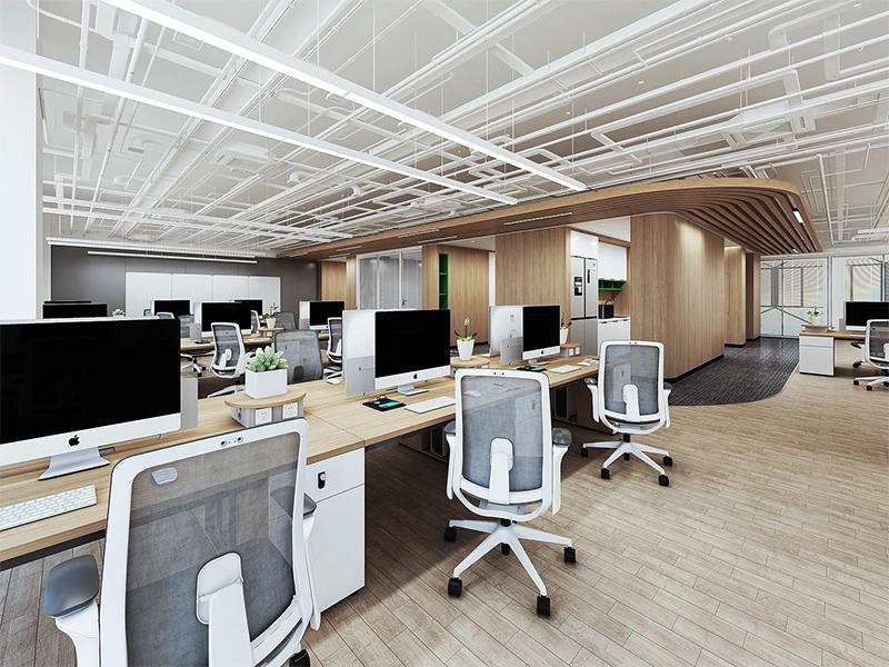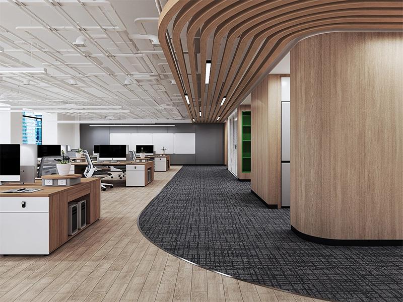 空间布局与功能分区是本次公装设计的重点,结合1300平开阔户型与新媒体业务场景,遵循“高效动线、多元适配”原则,实现功能与体验的双重优化。开放办公区作为核心区域,采用模块化工位布局,适配新媒体运营、编辑等多岗位协同作业需求,木质桌面搭配白色柜体,兼顾收纳与视觉通透感,同时通过深灰色地毯与浅木色木地板的材质分区,自然划分出行进动线与作业区域,在最大化利用空间的同时,避免了动线交叉带来的干扰。