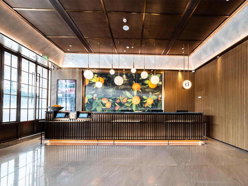 酒店大堂的设计的是壹西格玛匠心的直观体现,团队以温暖质感与精致细节为核心,选用深色金属质感吊顶搭配木质格栅墙面,在沉稳中营造出丰富层次,巧妙弱化了冰冷感,增添了空间温度。背景墙一幅色彩明快的橘子主题艺术画,搭配大小不一的球形吊灯,是设计中的点睛之笔,既打破了简约空间的单调,又注入了鲜活活力,与黑色金属格栅打造的简洁前台相互呼应,构建出大气又细腻的第一印象,契合壹西格玛“铸造完美,杜绝遗憾”的宗旨。