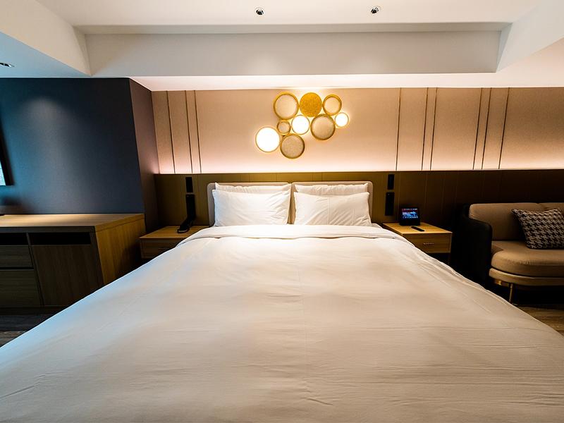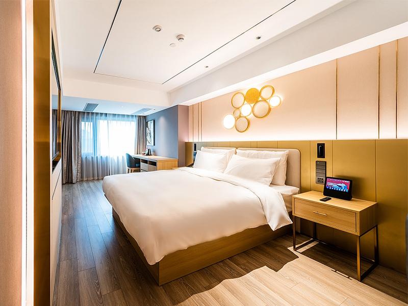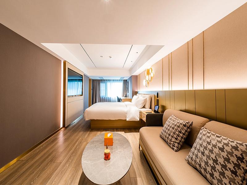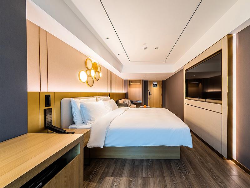 客房空间的设计则延续了整体风格的统一性,更藏着壹西格玛对实用与美学平衡的精准把控。浅木色地板搭配米金色软包背景墙,质地柔和温润,床头金色圆形艺术壁灯作为标志性元素,勾勒出轻奢格调,纯白床品与原木色家具的搭配,让舒适感贯穿始终。部分房间加入深色墙面撞色设计,简约中尽显高级;套房则规划出独立客厅区域,浅米色沙发搭配大理石茶几,与卧室自然连通,拓宽空间视野,适配商务与家庭等多元入住需求。