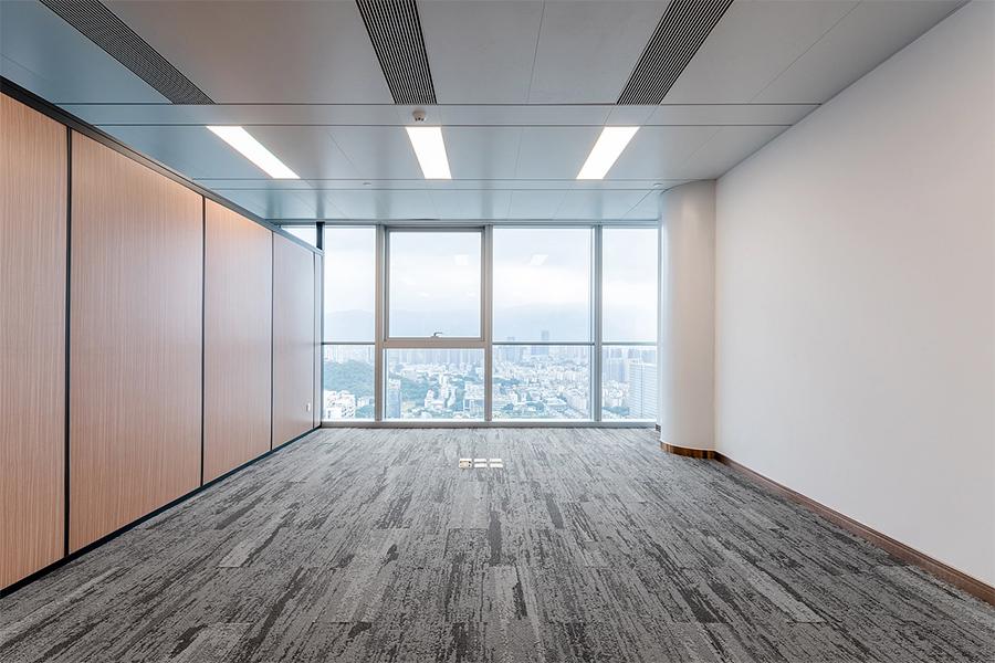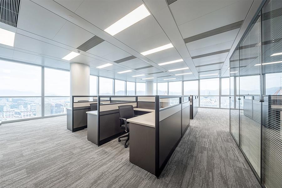 步入这层高空办公场域,最先映入眼帘的是整面落地玻璃幕墙。它将 360° 城市盛景引入室内,远处的楼宇轮廓与近处的烟火气息交织成流动的画卷,让办公不再局限于格子间,而是与城市脉搏同频。浅灰色调的地毯延伸至每个角落,在柔和的灯光下呈现细腻的纹理层次,为空间奠定沉稳雅致的基调。