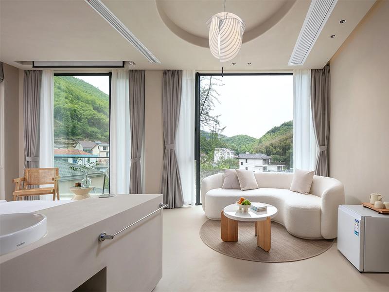 公区的设计延续了这份克制,弧形沙发呼应着顶面的圆弧吊顶,原木小茶几上的鲜果与香薰,在大落地窗的取景框里,将远山绿意与村落烟火纳入室内。洗手台的圆弧倒角、悬挂式圆镜与棉麻窗帘的垂坠质感,细节处都流露着侘寂美学的质朴与细腻,这也是壹西格玛在空间营造中的专业表达。