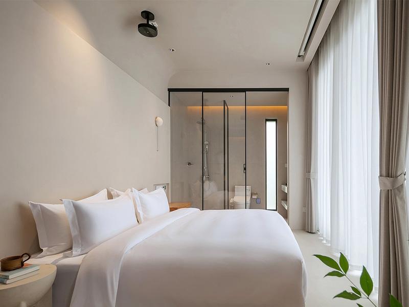 玻璃围合的卫浴区打破了空间边界,既保证通透采光,又让洗漱场景与卧室形成轻盈互动。这正是壹西格玛在极简民宿空间打造中的专业巧思,让功能与美学达成平衡。