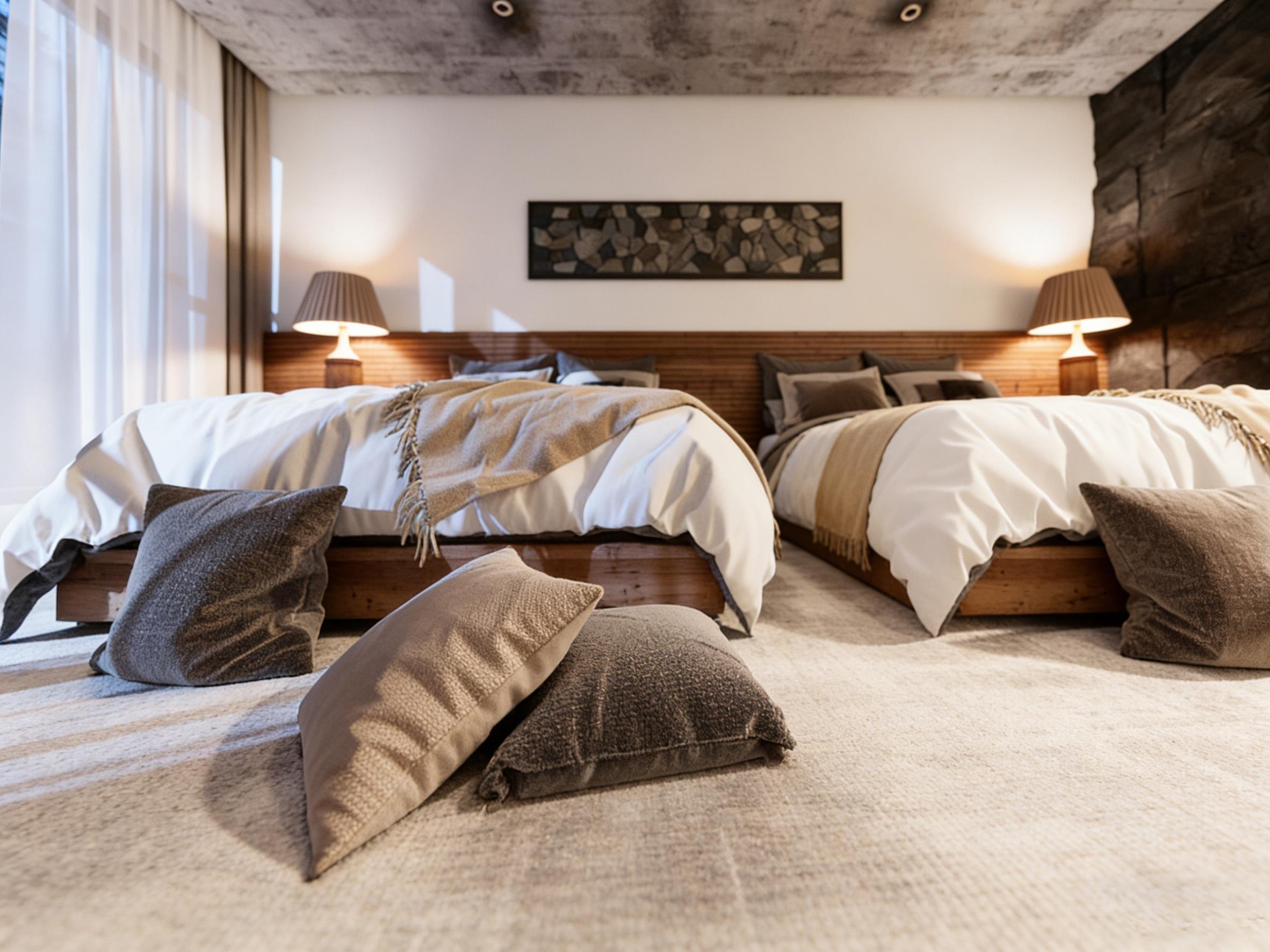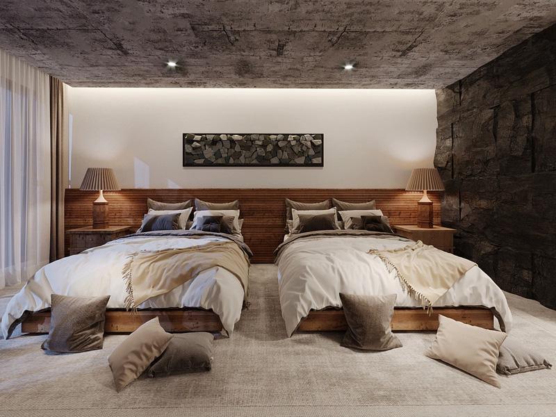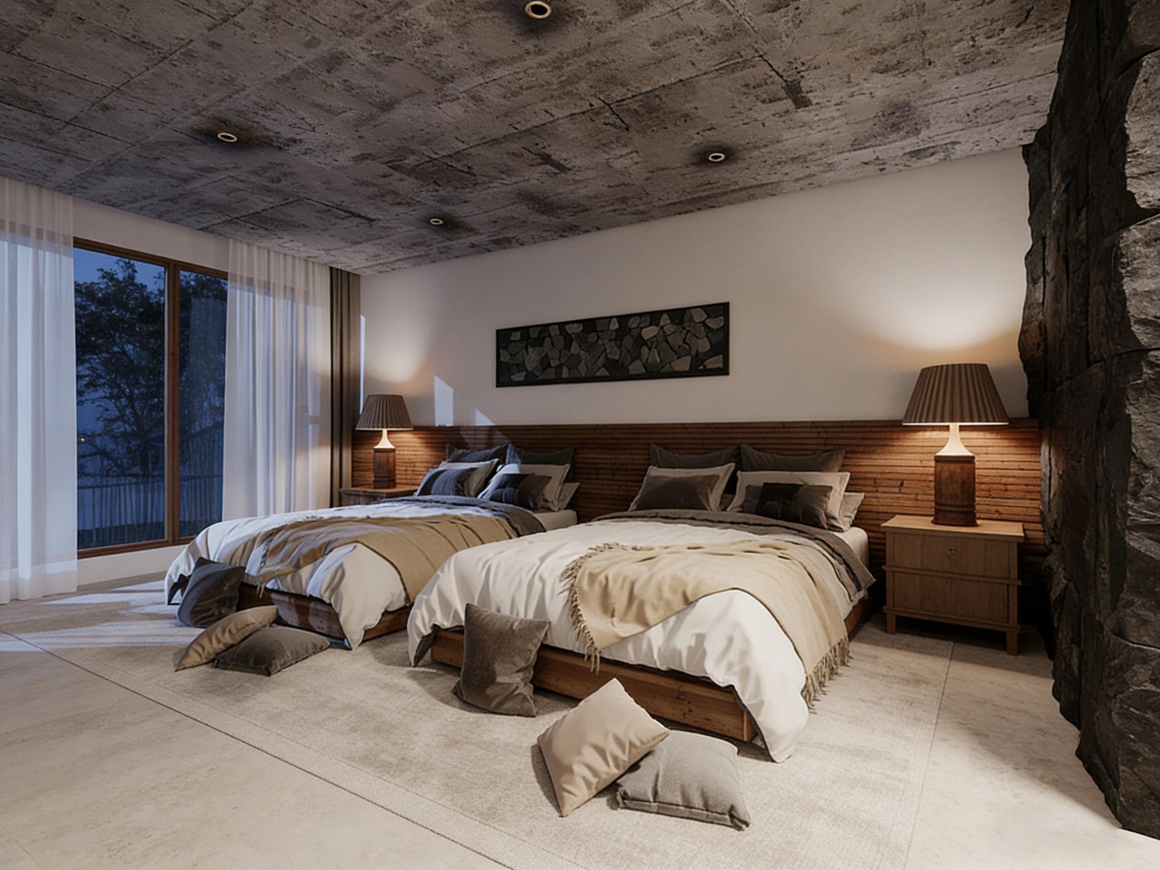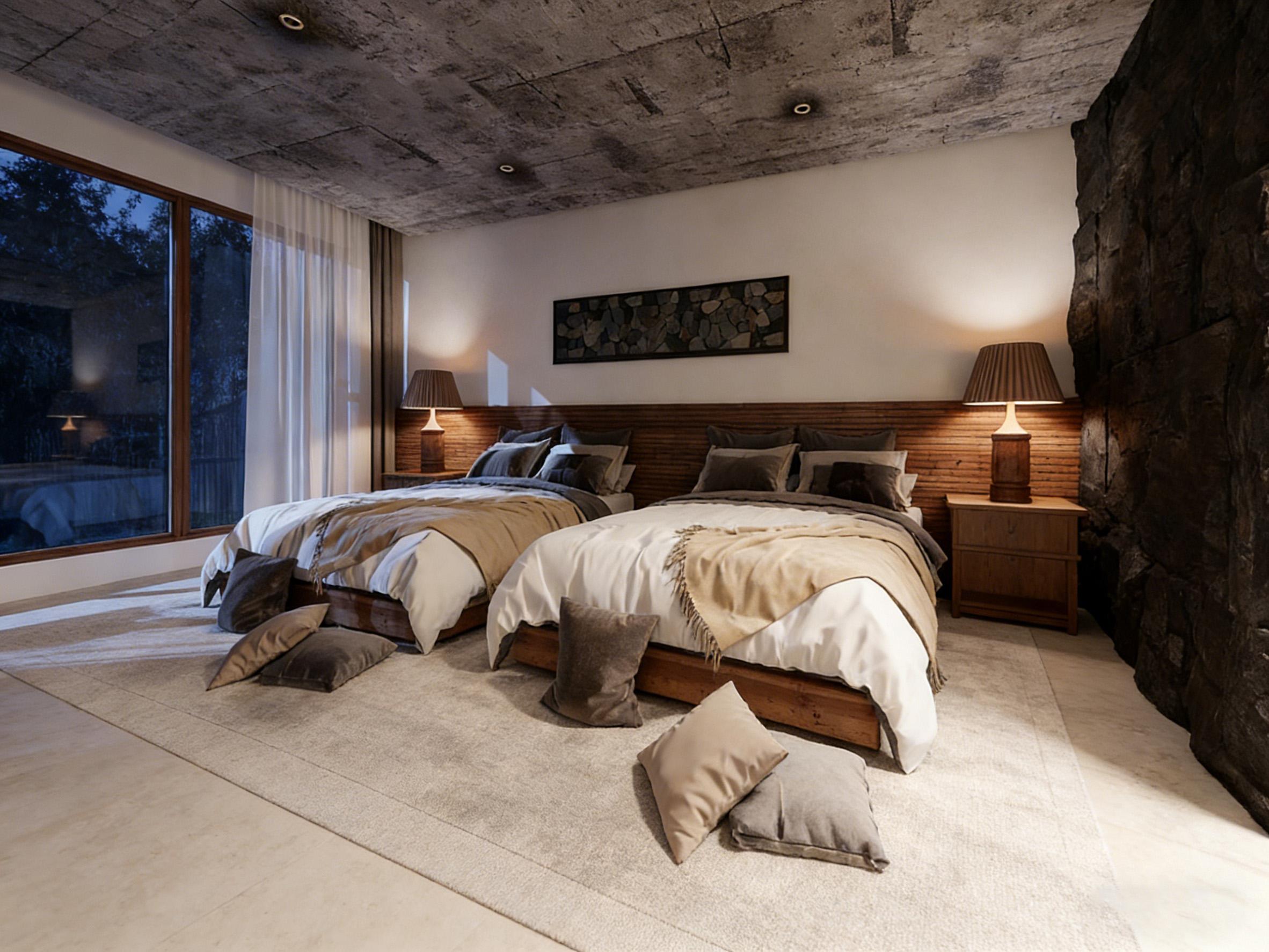 空间以质朴的材质语言构建氛围:裸露的混凝土天花板保留原始肌理,右侧的天然石墙与木质床头背景形成冷暖对比,传递出未经雕琢的自然力量。两张木质床架采用简约线条,搭配米白床品与浅棕流苏毯,弱化了空间的厚重感,让侘寂风的松弛感自然流淌。地面铺设的浅灰地毯与散落的抱枕,既丰富了层次,又为空间注入温暖的触感。